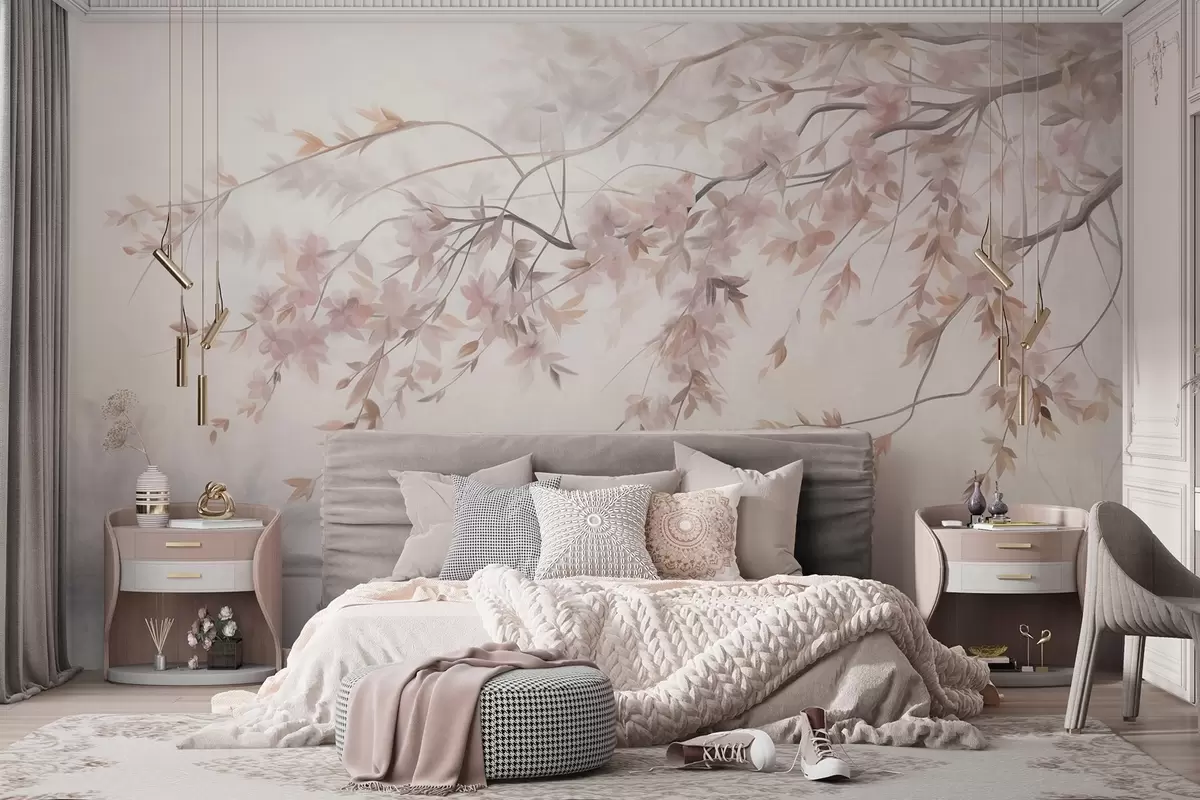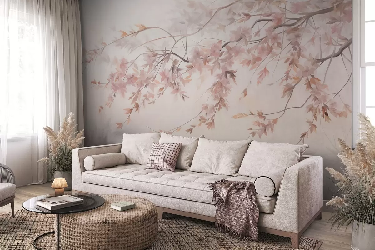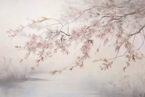 Zidne murale Teksturirani krajolik s grančicom trešnjinog cvijeta, ružičastim lišćem, mekom, maglovitom pozadinom br. w09743