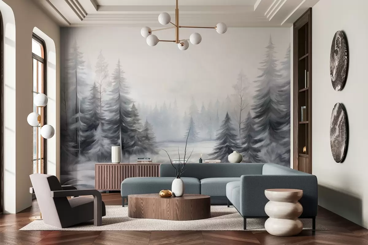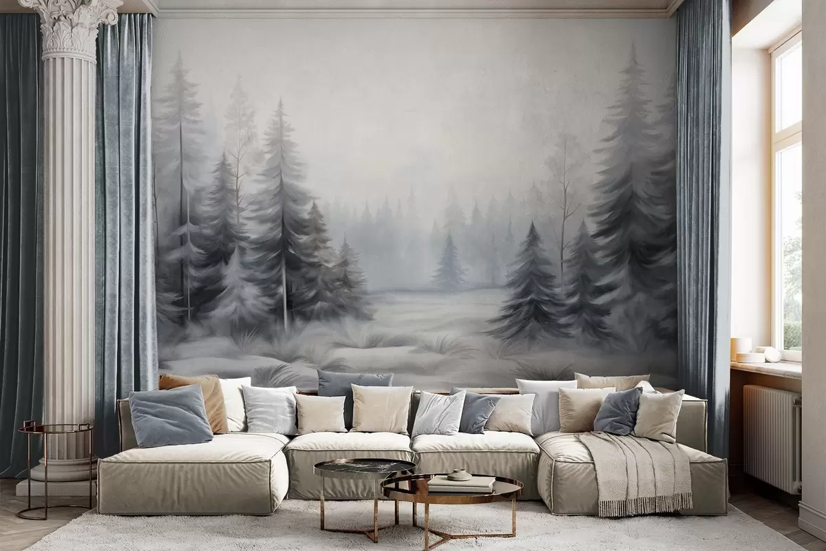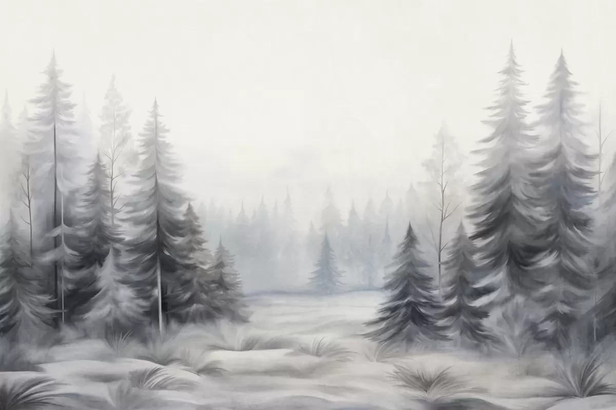 Zidne murale Teksturirano zimsko šumsko drveće u magli, u prigušenim sivim i bijelim tonovima br. w09745