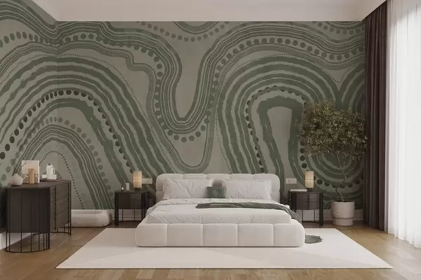 Zidne murale Apstraktne zelene i bež valovite linije i točkice, moderna teksturirana umjetnost br. w09747