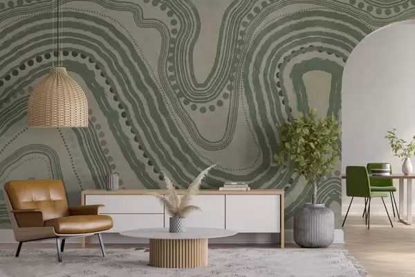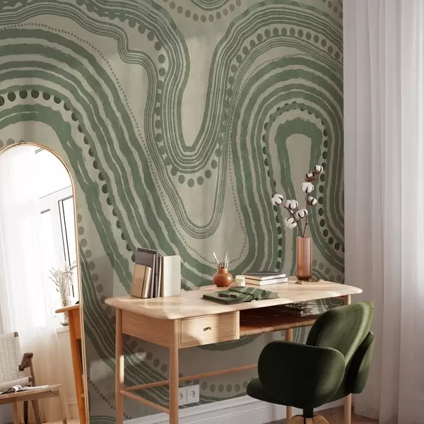 Zidne murale Apstraktne zelene i bež valovite linije i točkice, moderna teksturirana umjetnost br. w09747