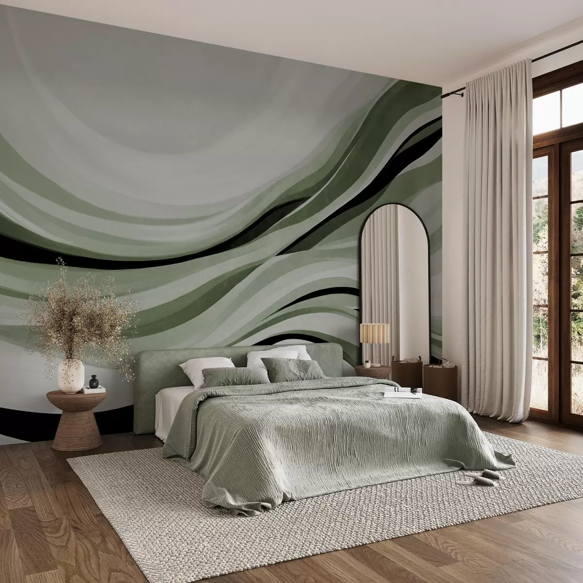 Zidne murale Apstraktne valovite linije u nijansama zelene i crne na svijetloj pozadini, teksturirana umjetnost br. w09748v1
