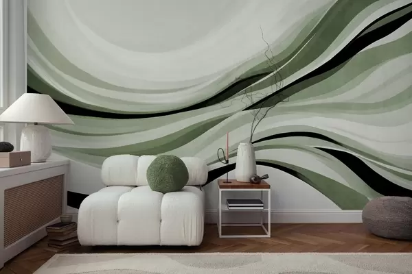 Zidne murale Apstraktne valovite linije u nijansama zelene i crne na svijetloj pozadini, teksturirana umjetnost br. w09748v1