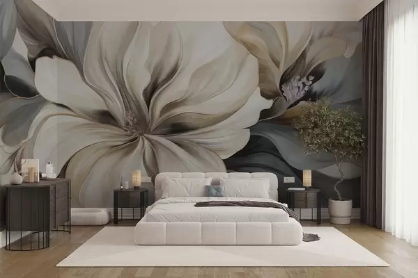 Zidne murale Veliki, kremasti cvjetovi magnolije sa smeđim i sivim listovima, mekana rasvjeta, apstraktna pozadina br. w09749