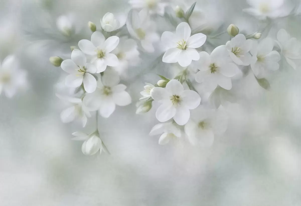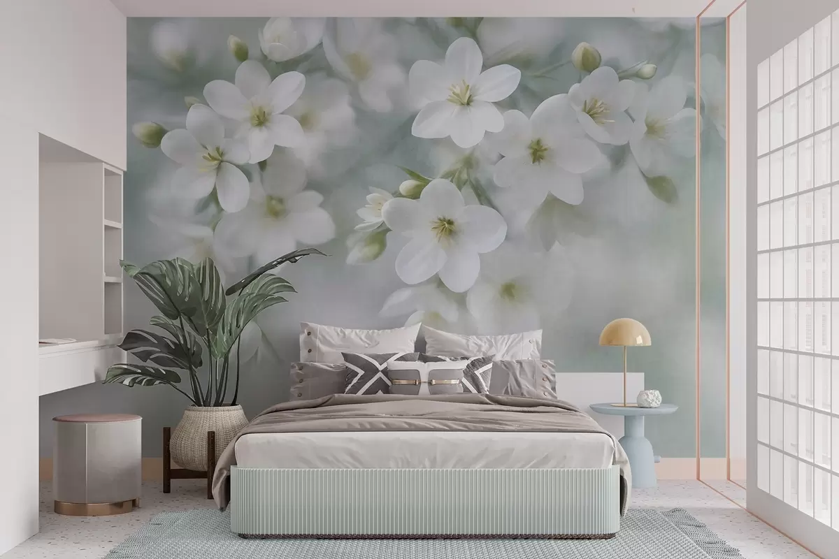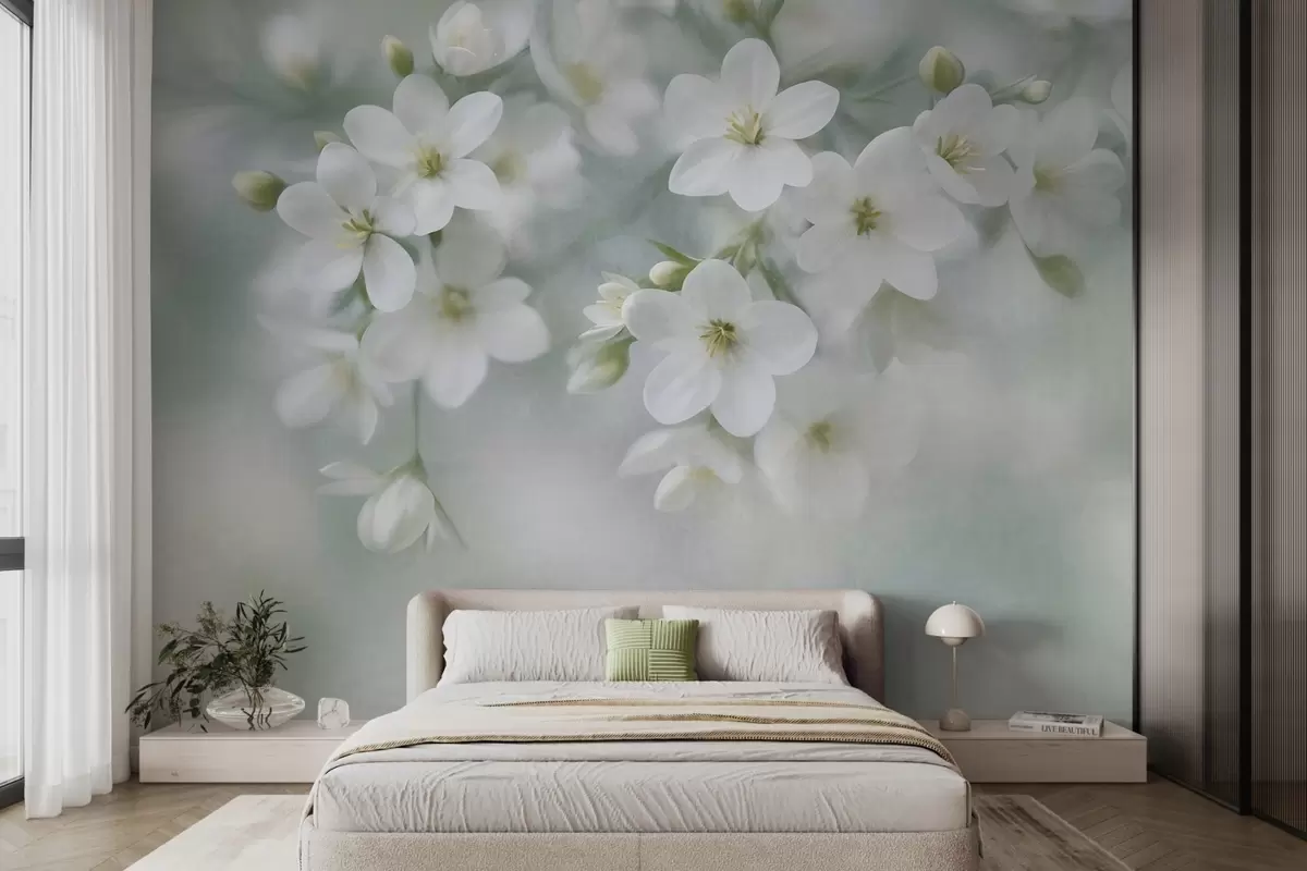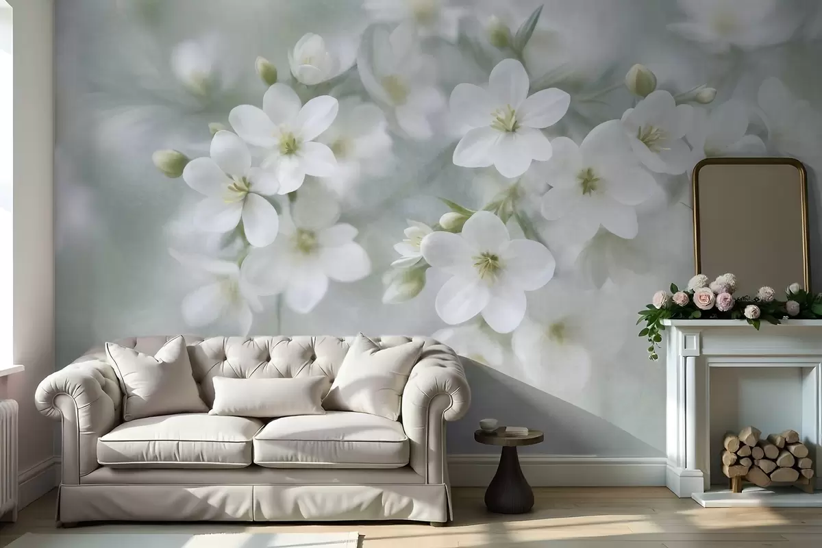 Zidne murale Nježno teksturirano bijelo cvijeće nježno zamućeno u pozadini br. w09759
