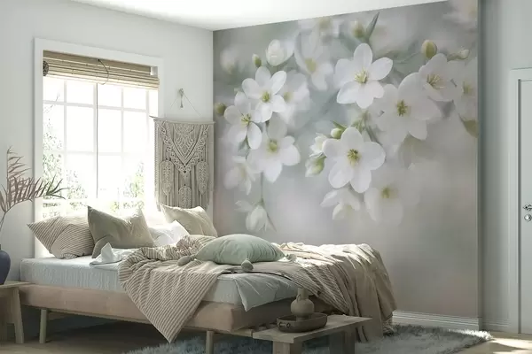 Zidne murale Nježno teksturirano bijelo cvijeće nježno zamućeno u pozadini br. w09759