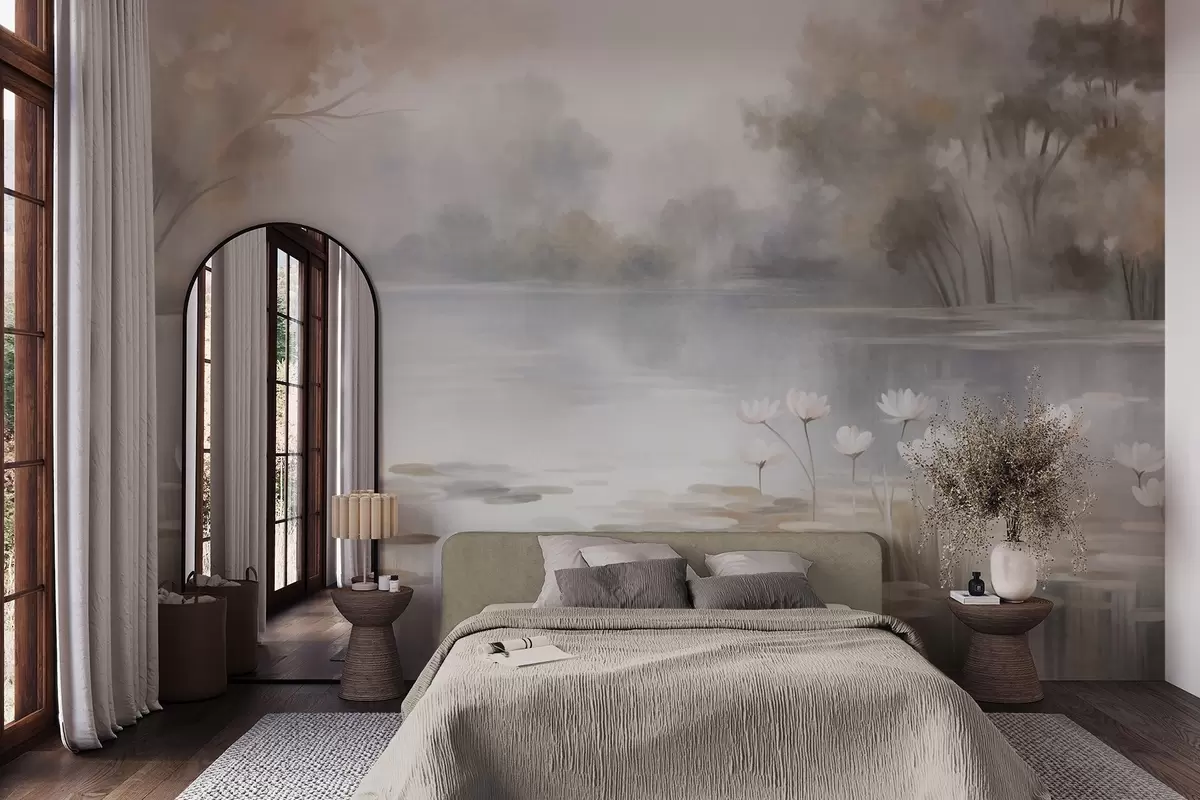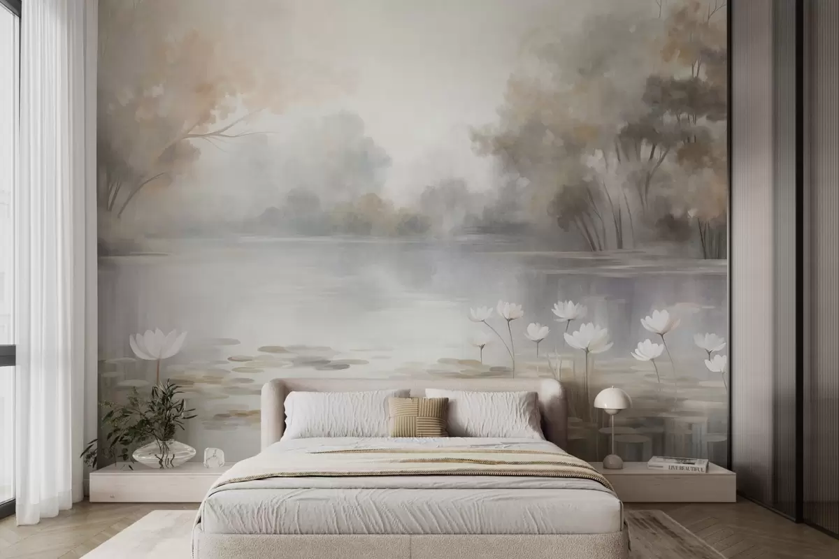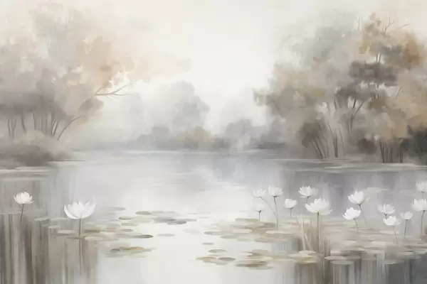 Zidne murale Teksturirani krajolik, jezero s bijelim lopočima, okruženo drvećem u prigušenim bojama br. w09768