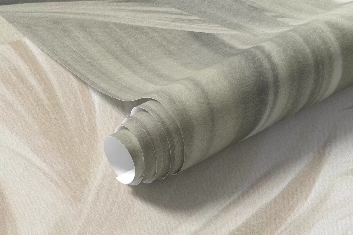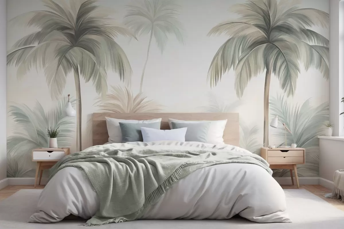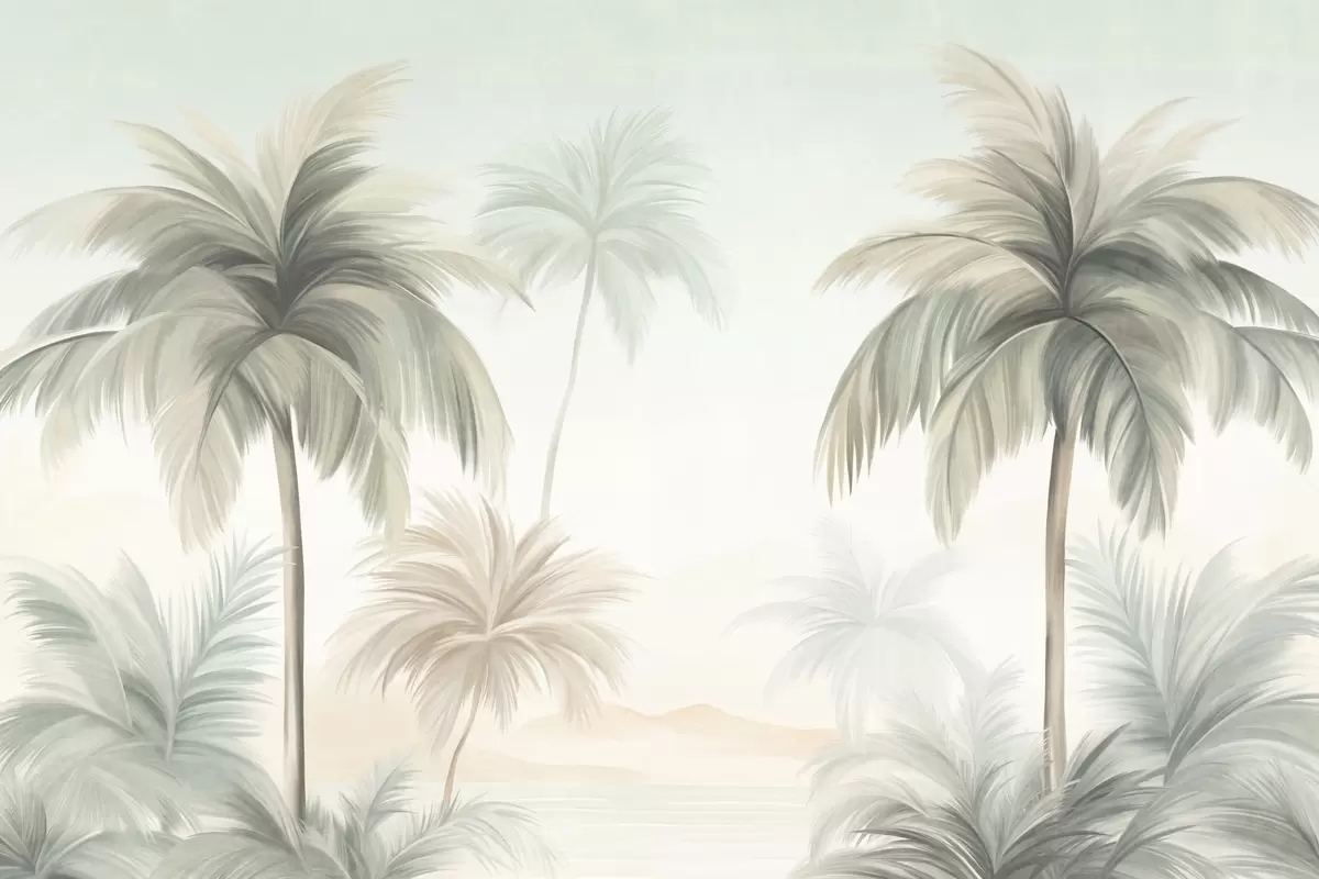 Zidne murale Stabla teksturirane palmama s prigušenim zelenim i bež listovima nasuprot mekom nebu br. w09770