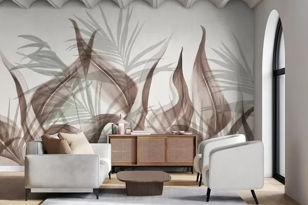 Zidne murale Tropsko lišće u nijansama smeđe i zelene na bijeloj pozadini, teksturirano u akvarelu br. w09772