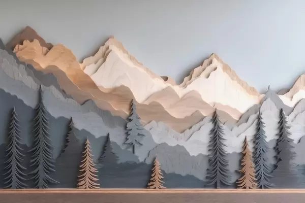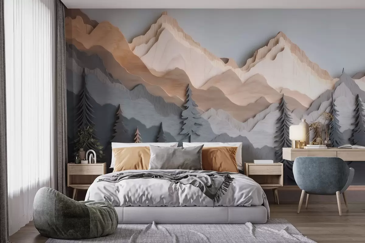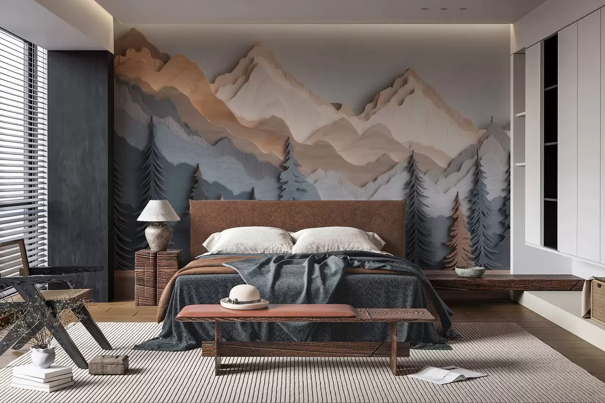 Zidne murale Prirodni krajolik s borovima i planinama u stilu rezbarenog drva br. w09793