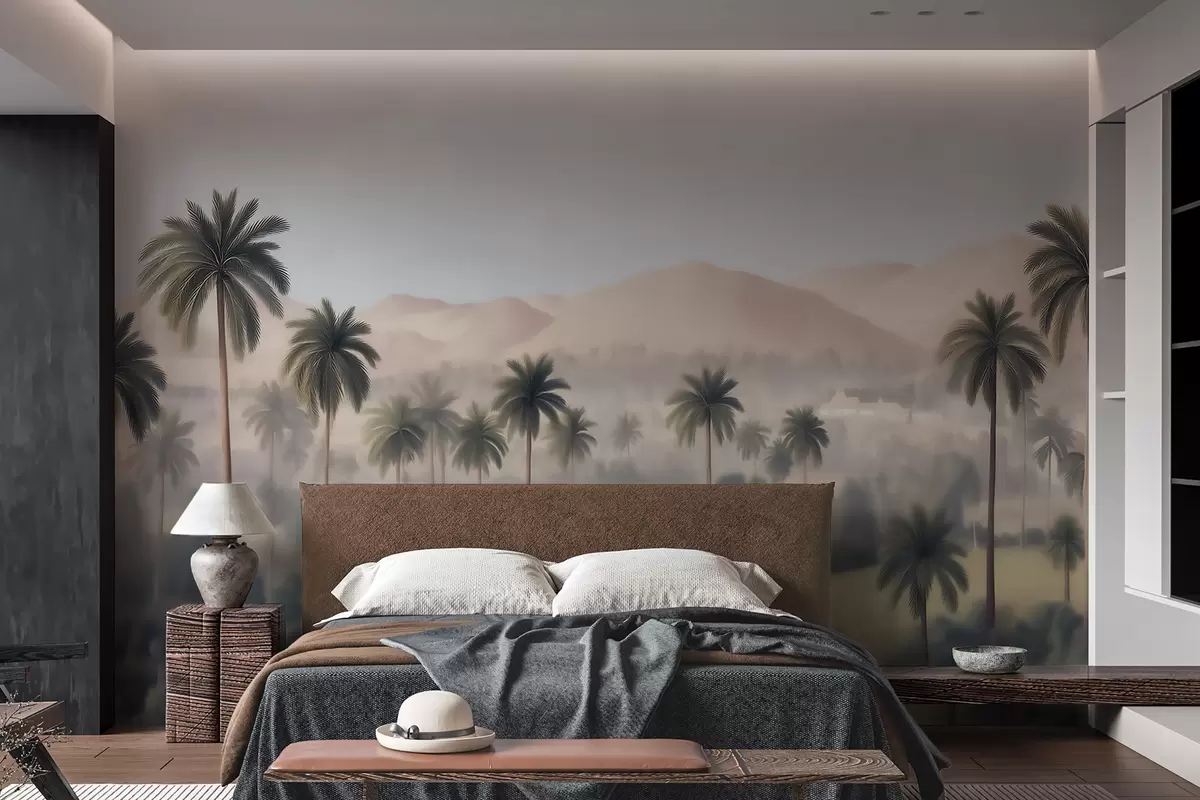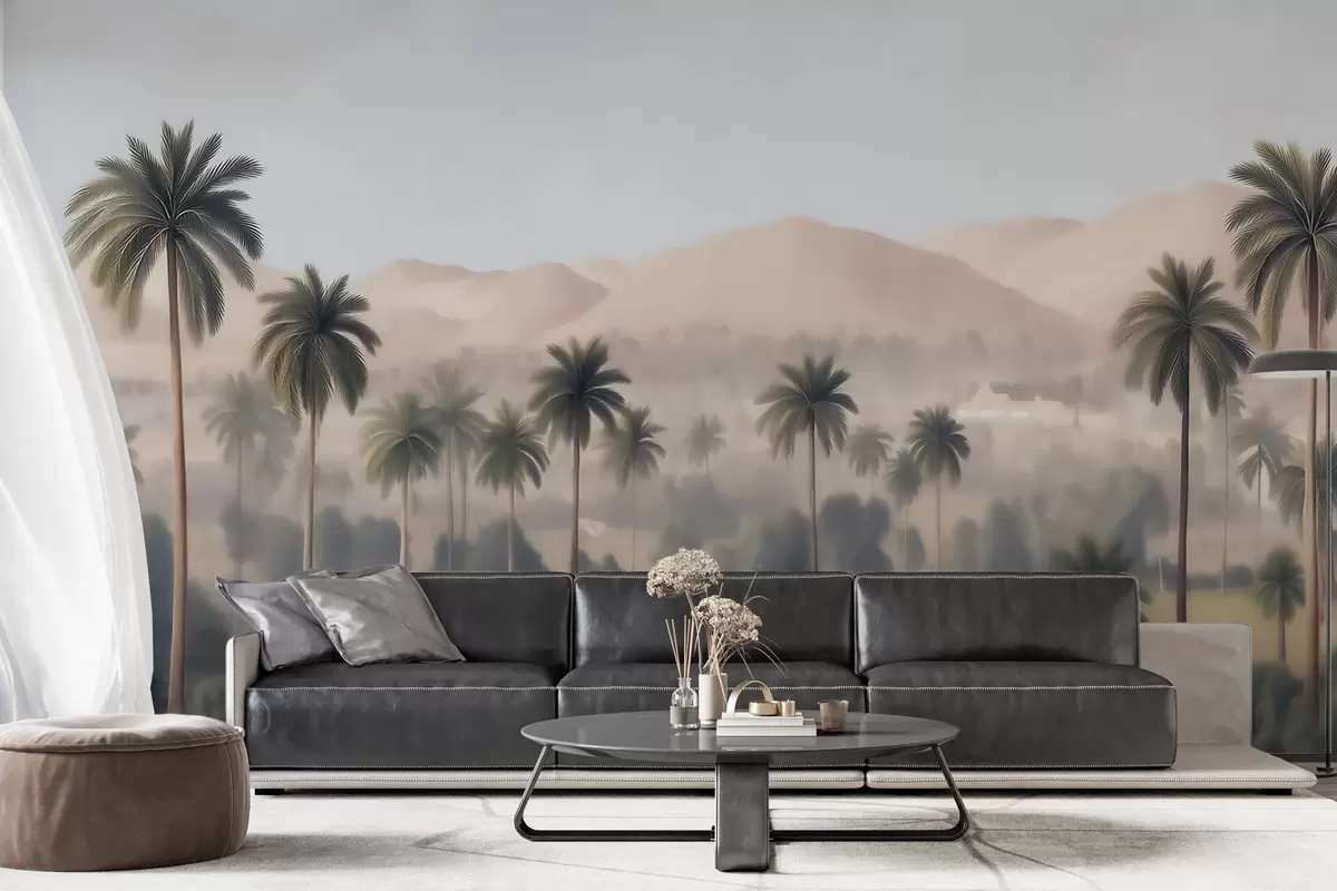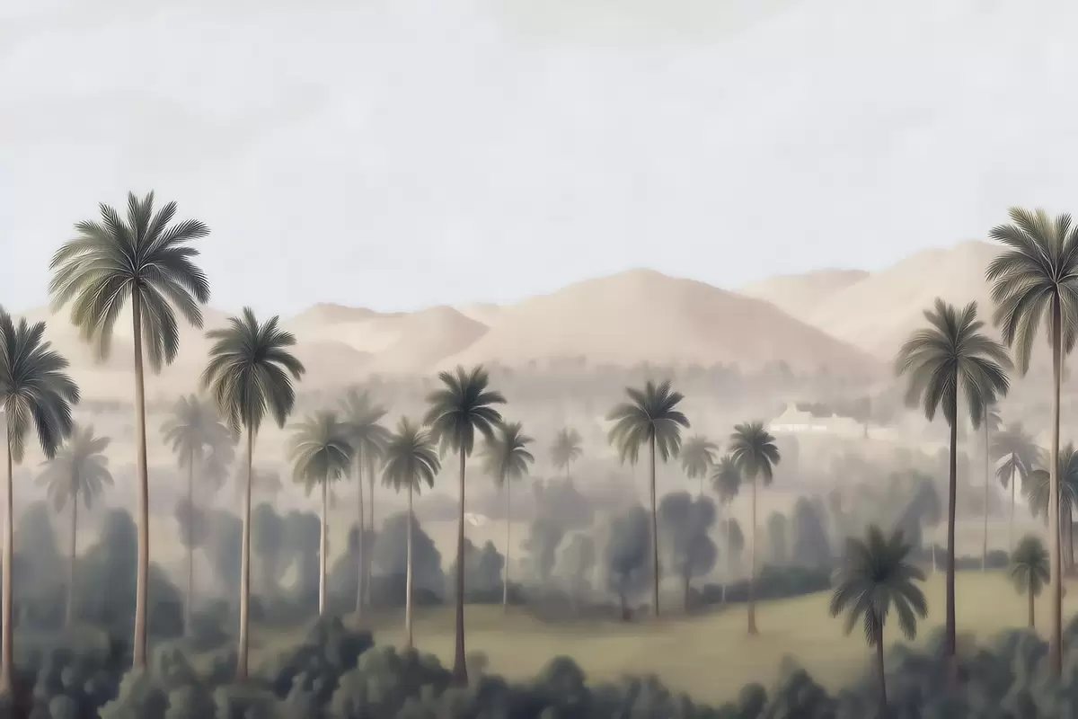 Zidne murale Tropski krajolik s palmama i planinama, vintage panorama u bež i zelenim tonovima br. w09798