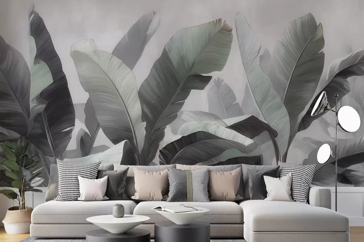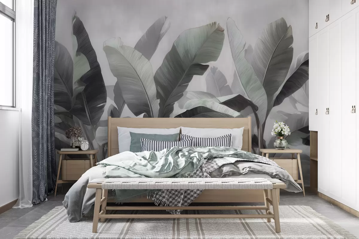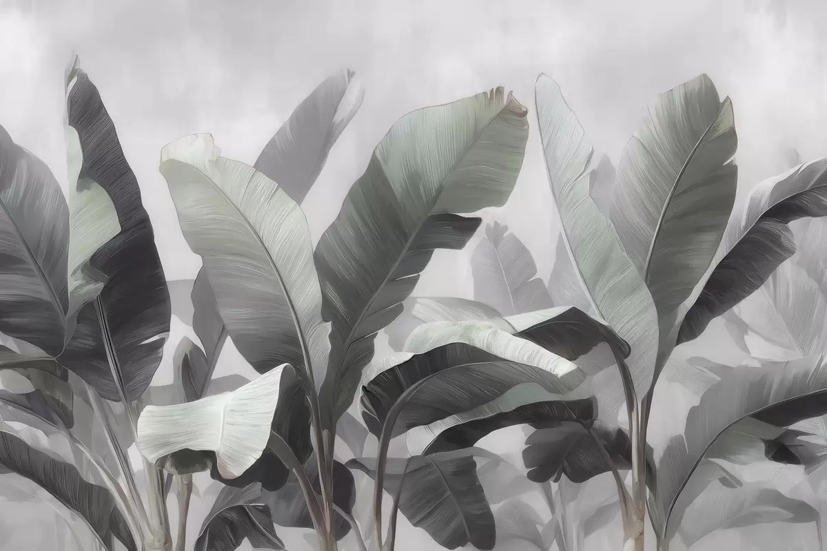 Zidne murale Apstraktni tropski veliki listovi banane u neutralnoj paleti s mekim sivo-zelenim tonovima br. w09805