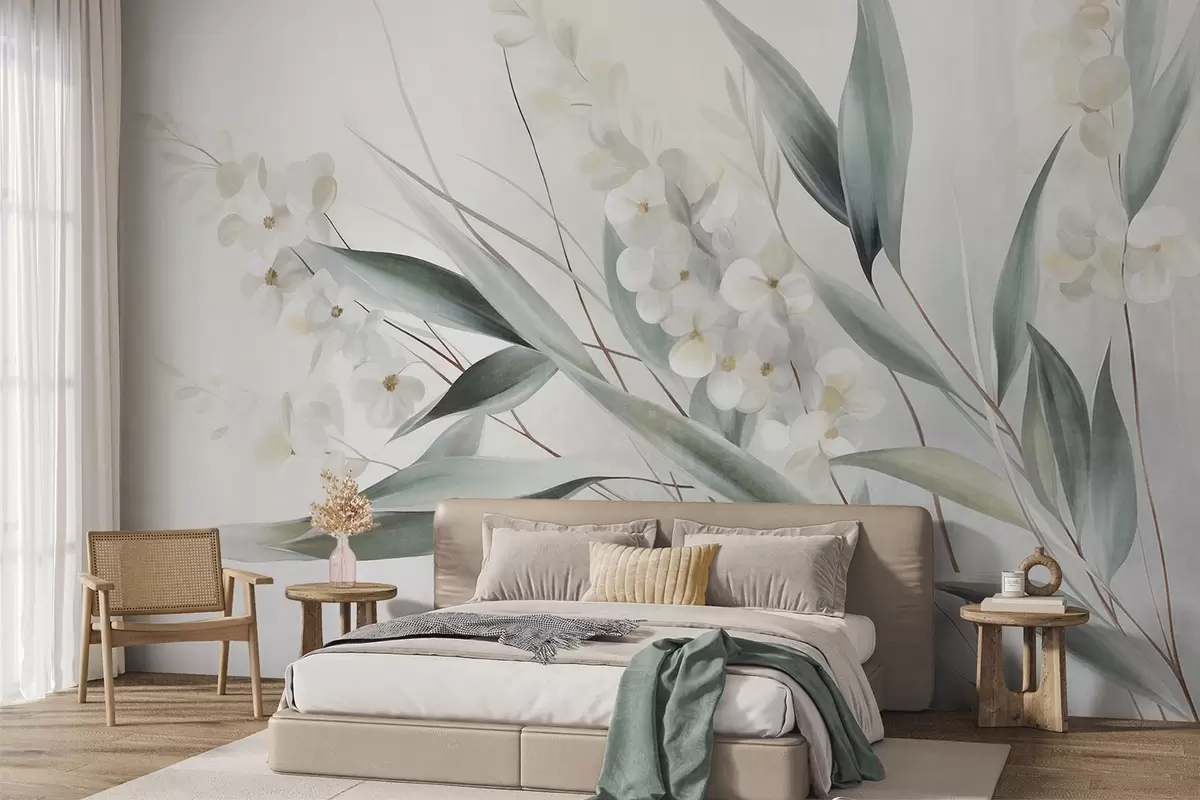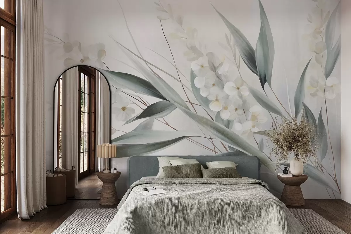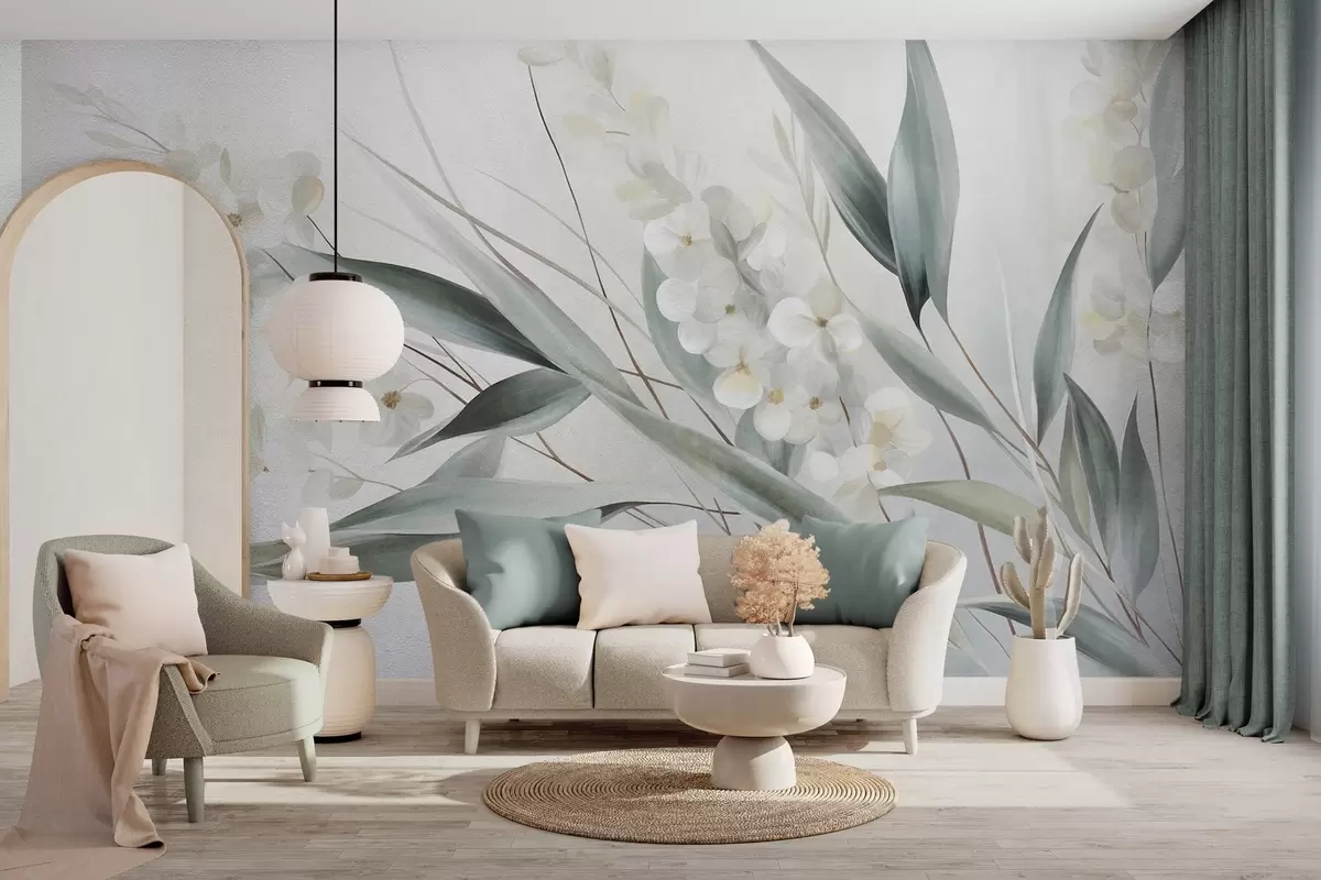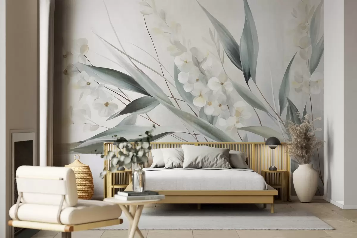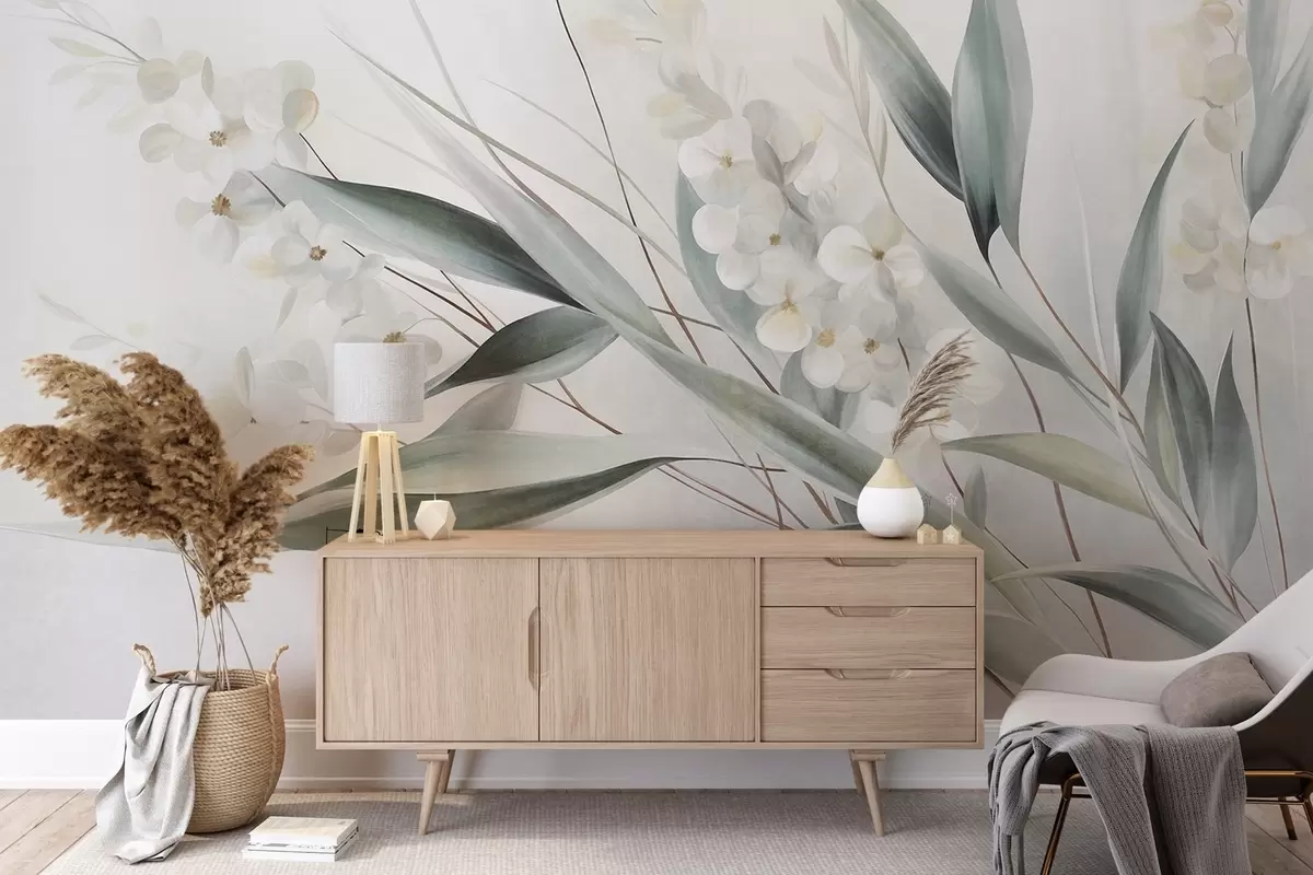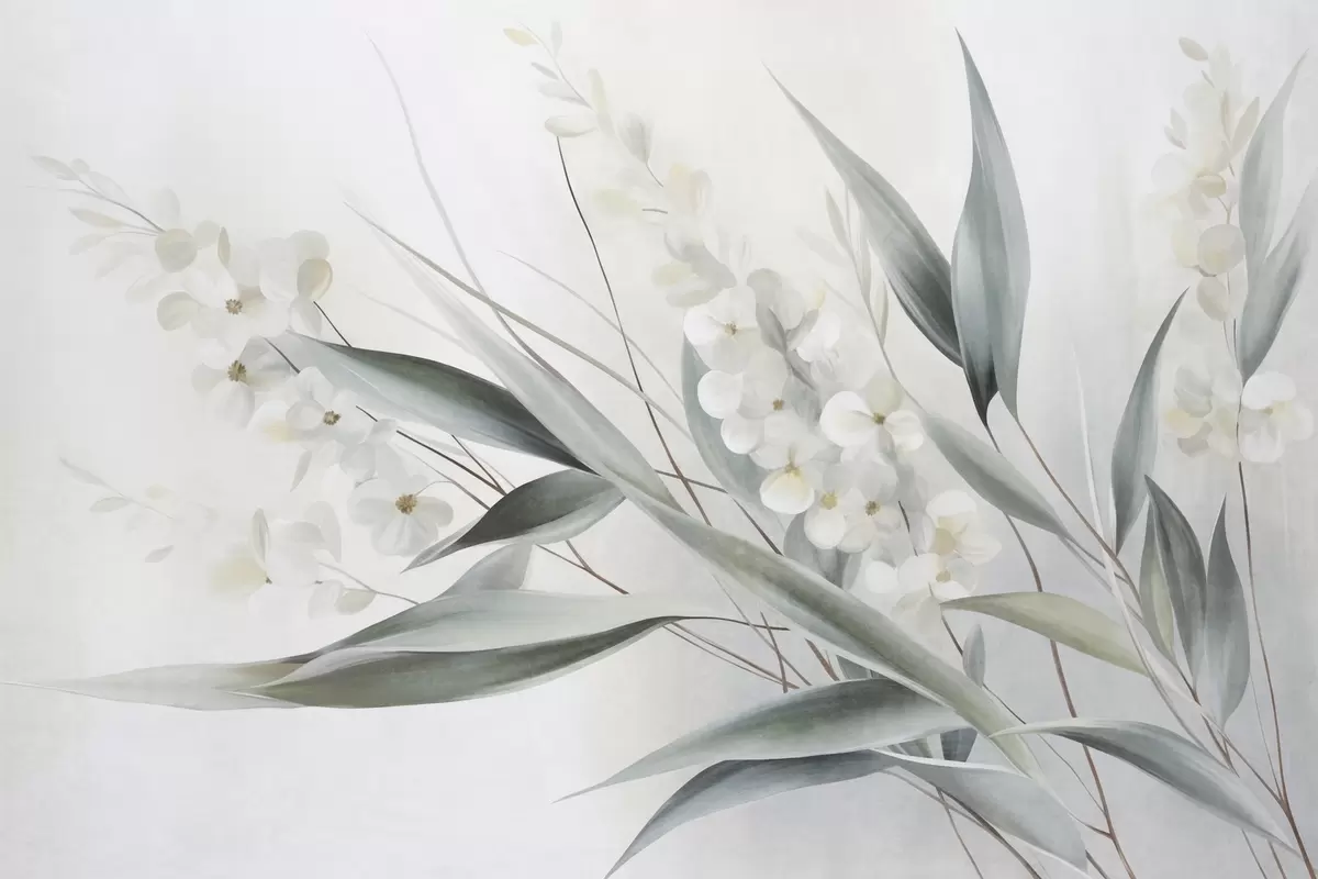 Zidne murale Nježno cvijeće i dugi zeleni listovi u slikarskom stilu sa suptilnim potezima kista, teksturiranom umjetnošću br. w09827