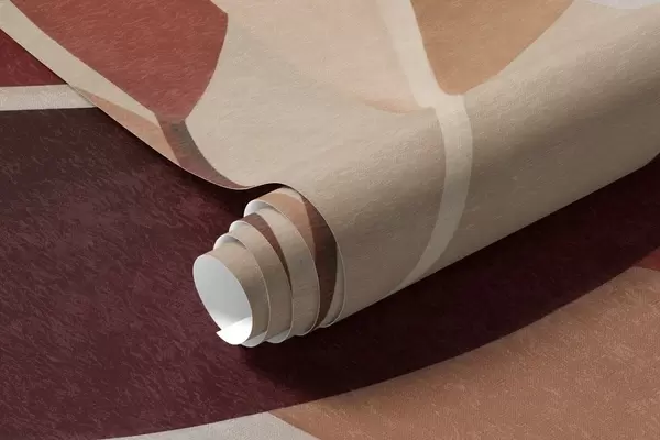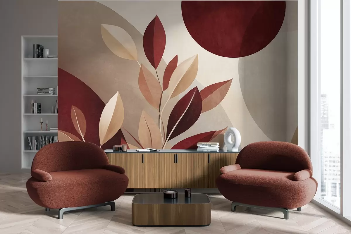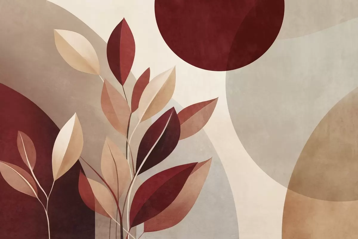 Zidne murale Teksturirano bordo i bež lišće na pozadini apstraktnih oblika, minimalizam, moderna umjetnost br. w09829
