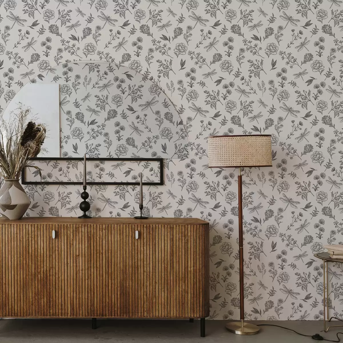 Tapeta Cvijeće, lišće i vretenca na bijeloj pozadini br. a00025v1