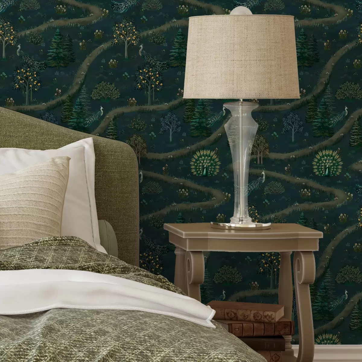 Tapeta Vijugava staza s paunovima i stablima limuna na tamnoj pozadini br. a00041v1