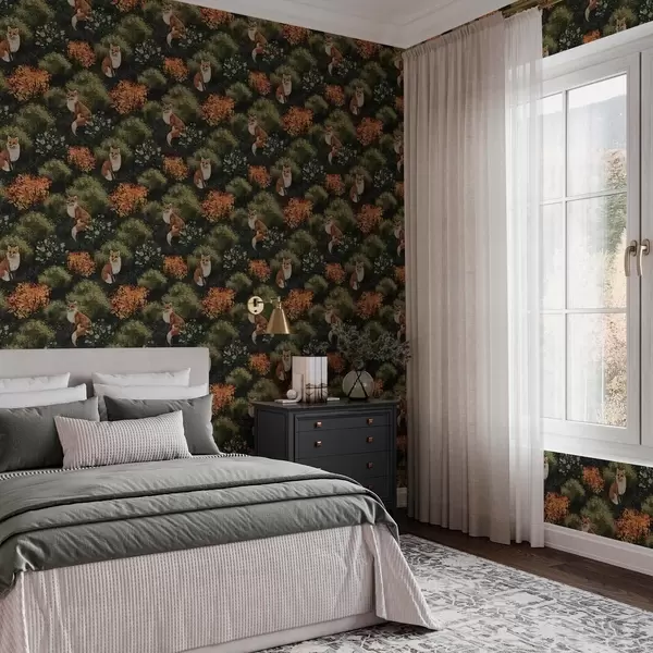 Tapeta Lisičarke u šumi s jesenskim grmljem na tamnoj pozadini br. a00101