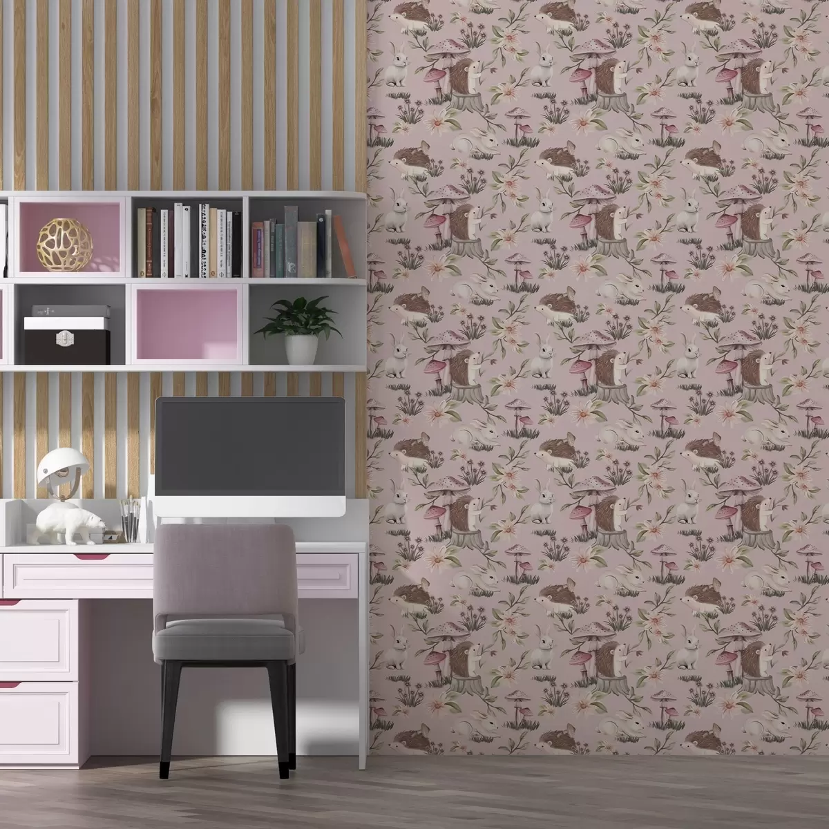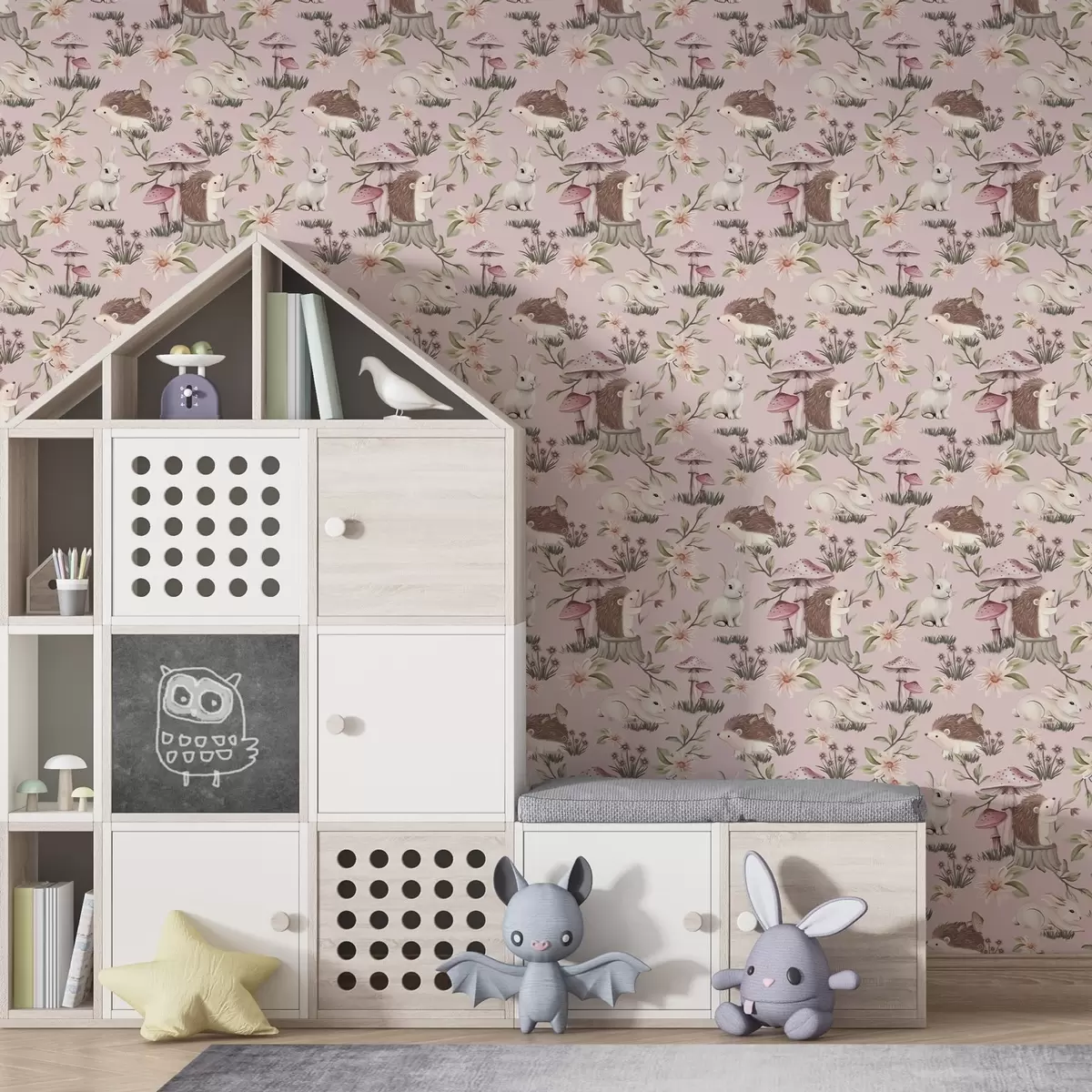 Tapeta Bajkoviti ježevi, zečevi i cvijeće među gljivama na ružičastoj pozadini br. a00111