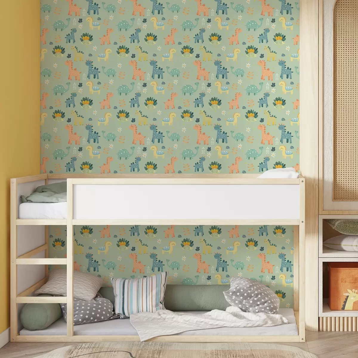 Tapeta Smiješni dinosauri u mekoj zelenoj paleti na svijetloj pozadini br. a00125v1