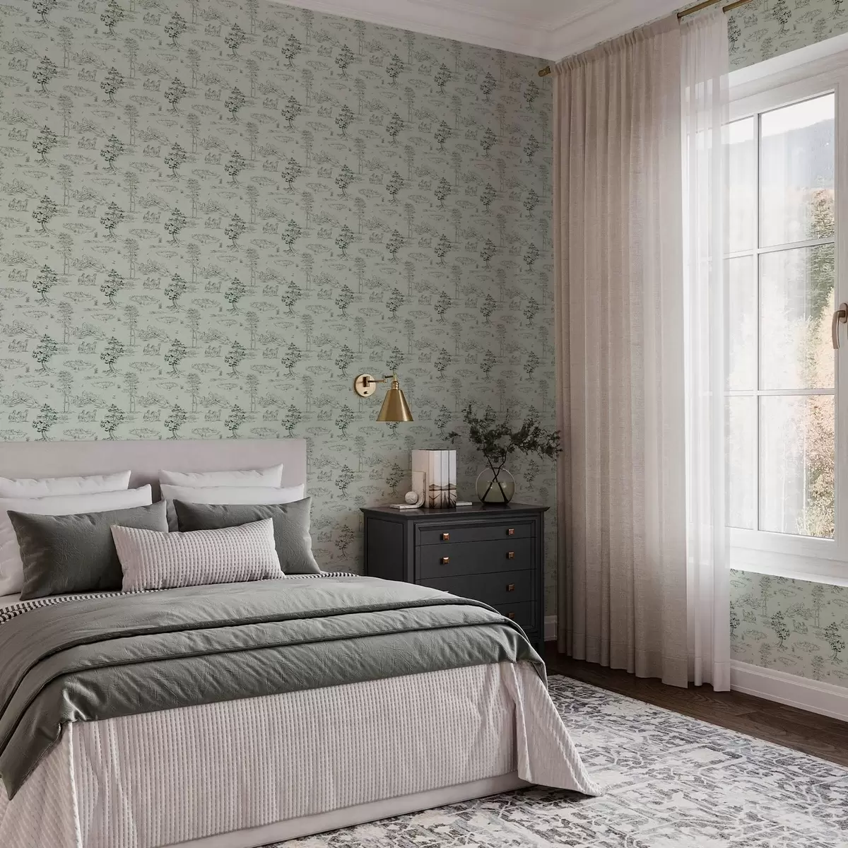 Tapeta Scena s konjima, drvećem i dvorcem na zelenoj pozadini br. a00133v1