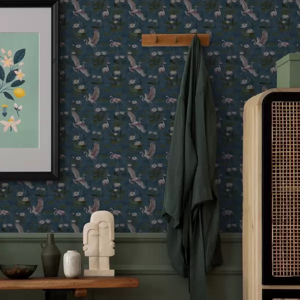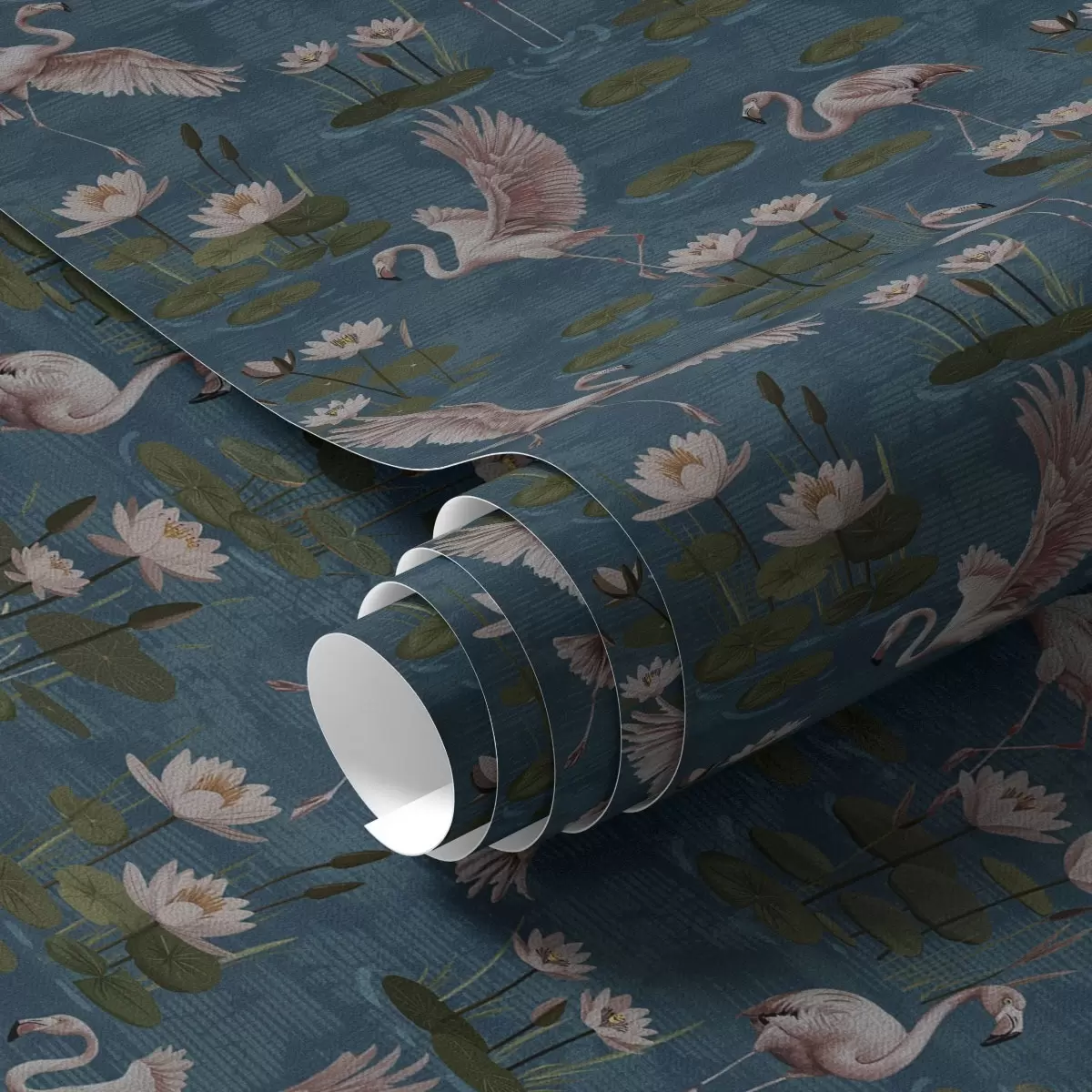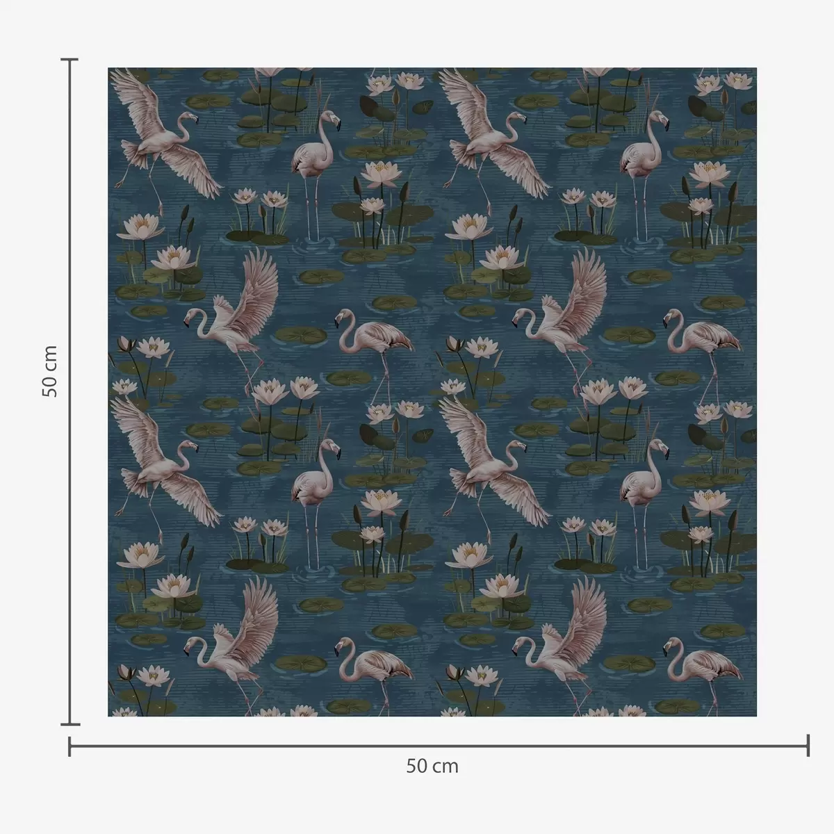 Tapeta Flamingo među lopočima, tropski prizor na tamnoplavoj pozadini br. a00237