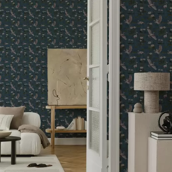 Tapeta Flamingo među lopočima, tropski prizor na tamnoplavoj pozadini br. a00237