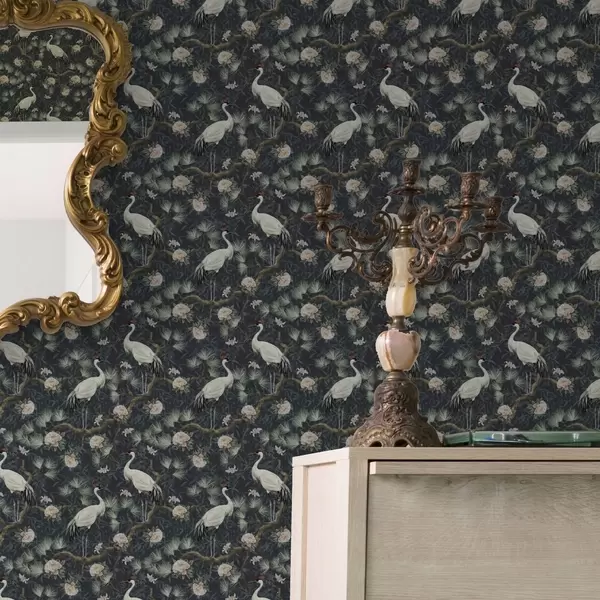 Tapeta Ždralovi među borovima i božurima na tamnoj pozadini br. a00241