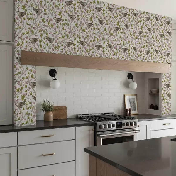 Tapeta Ptice na granama s lišćem i bobicama na bijeloj pozadini br. a00283
