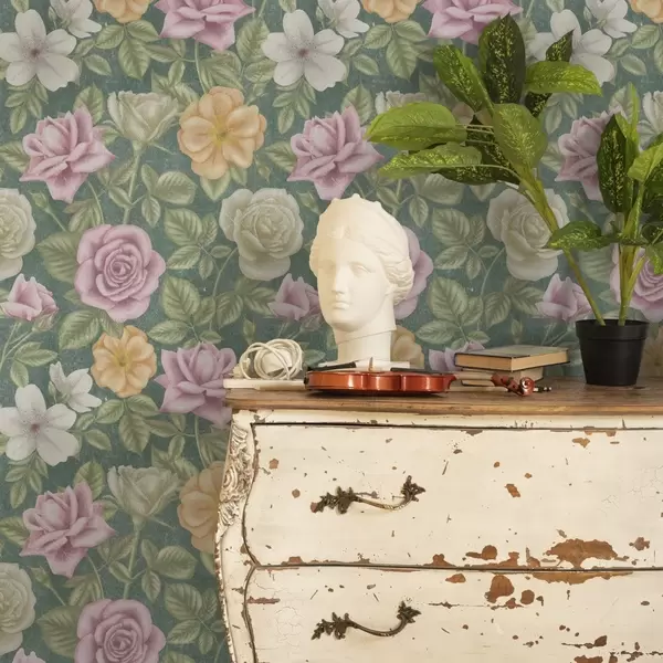 Tapeta Ružičasto-krem i žute ruže na zelenoj pozadini br. a00300