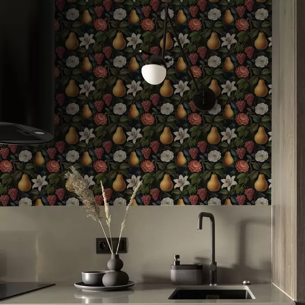 Tapeta Barokno voće i cvijeće na dramatičnoj tamnoj pozadini br. a00387