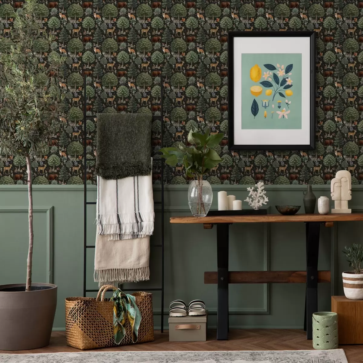 Tapeta Akvarel šumskih životinja s drvećem i gljivama br. a00391