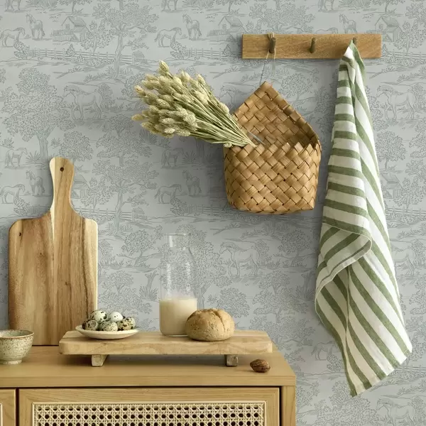 Tapeta Zeleni monokromatski krajolik s konjima i kućicama br. a00407