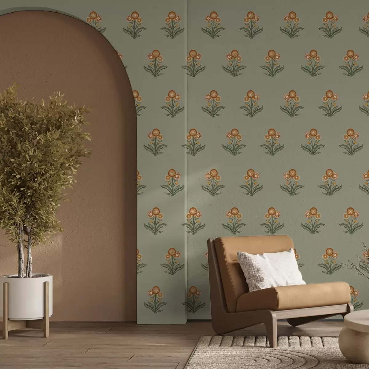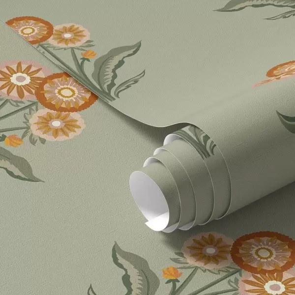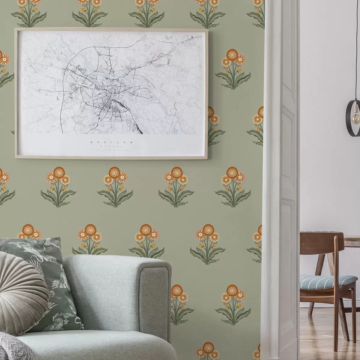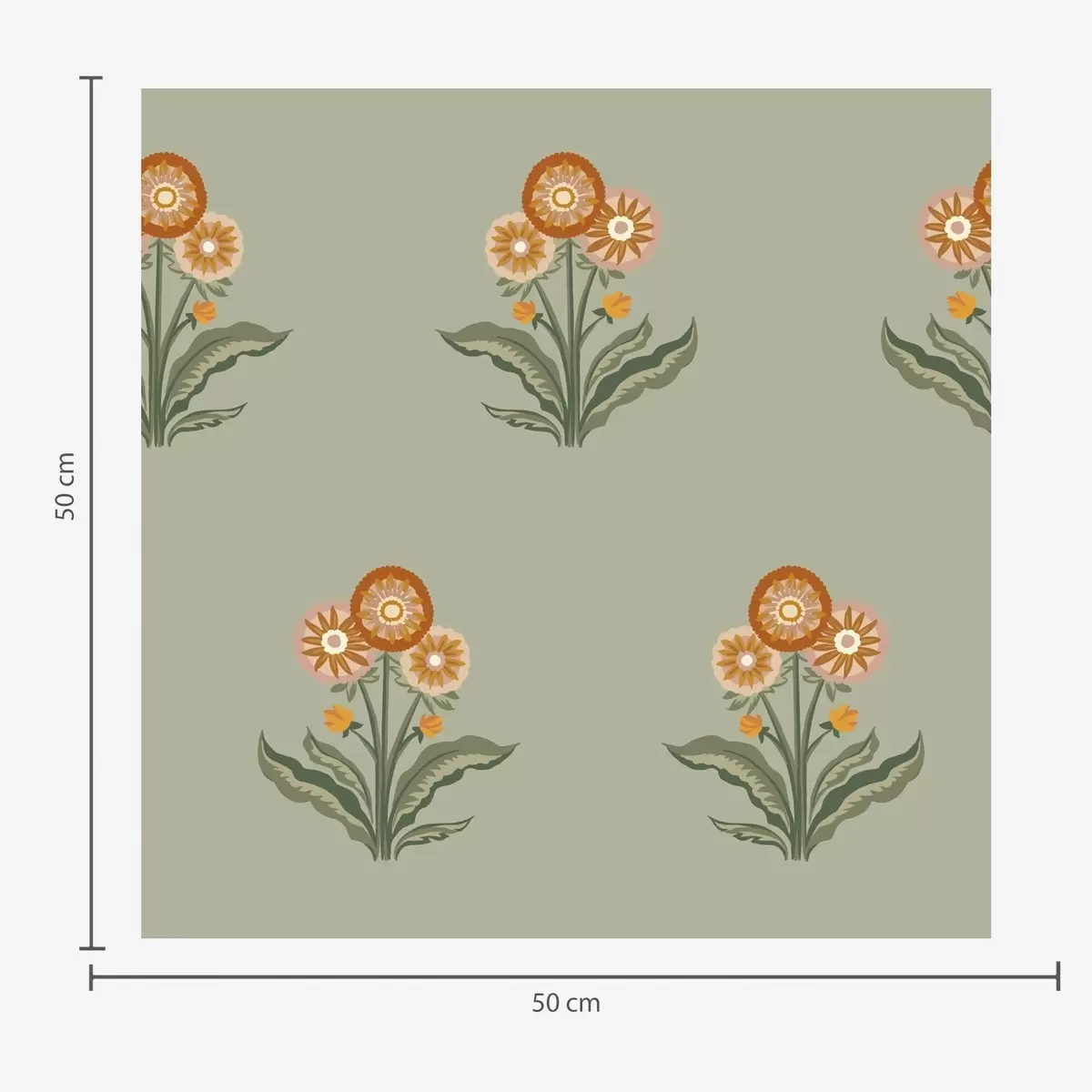 Tapeta Stilizirano cvijeće na maslinastoj pozadini, topli tonovi br. a00494v2