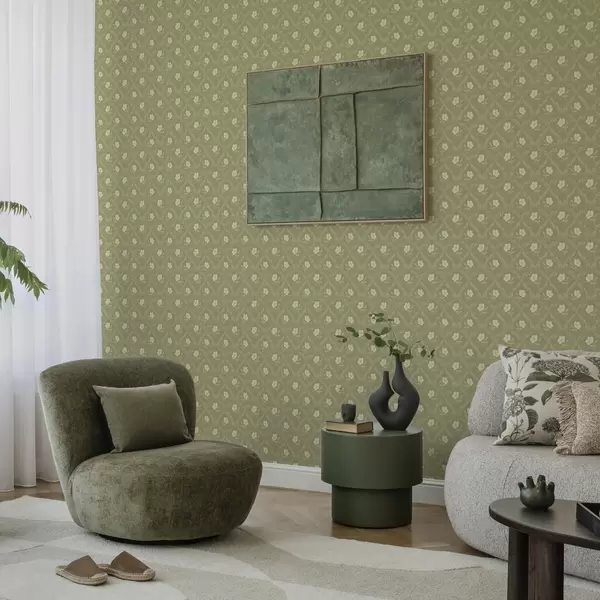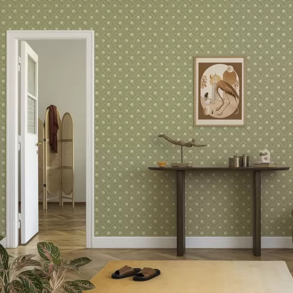 Tapeta Maslinova rešetka s kremastim cvijećem, retro ukras br. a00585