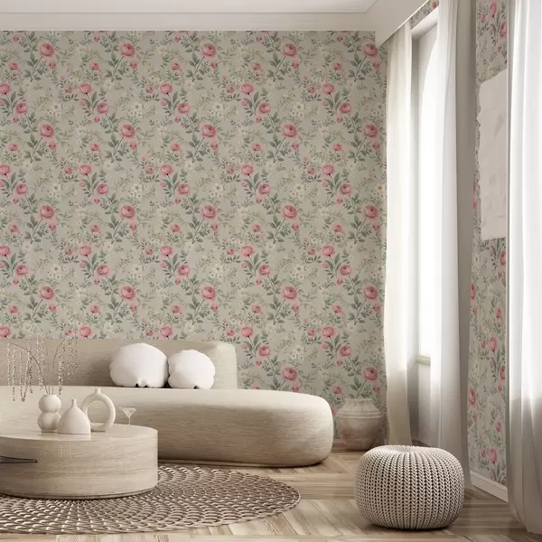 Tapeta Akvarel božuri i bijelo cvijeće na sivo-bež boji br. a00592