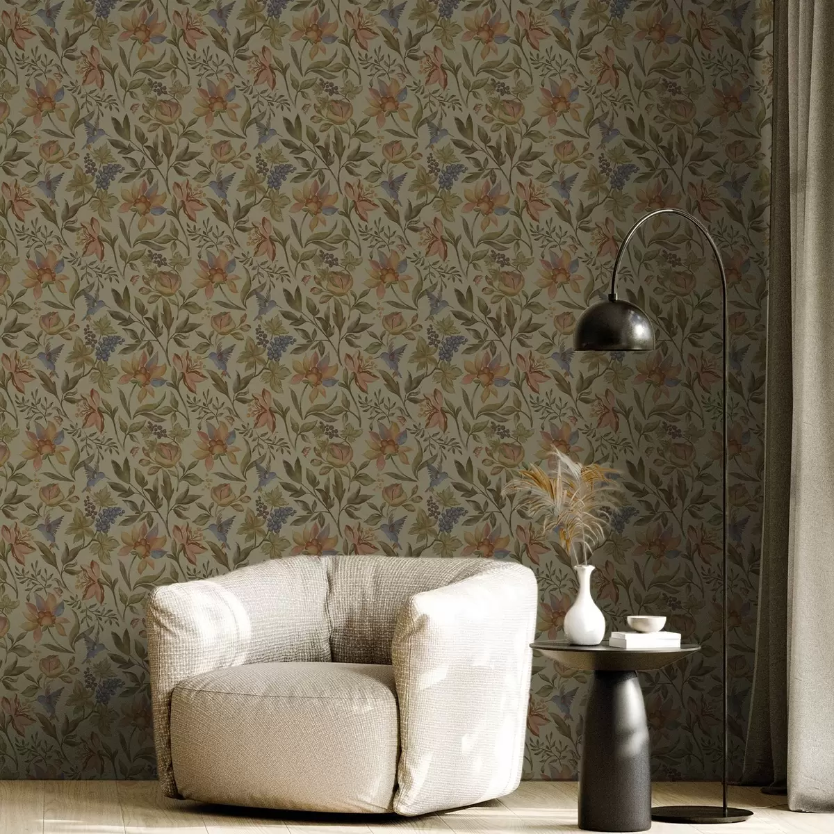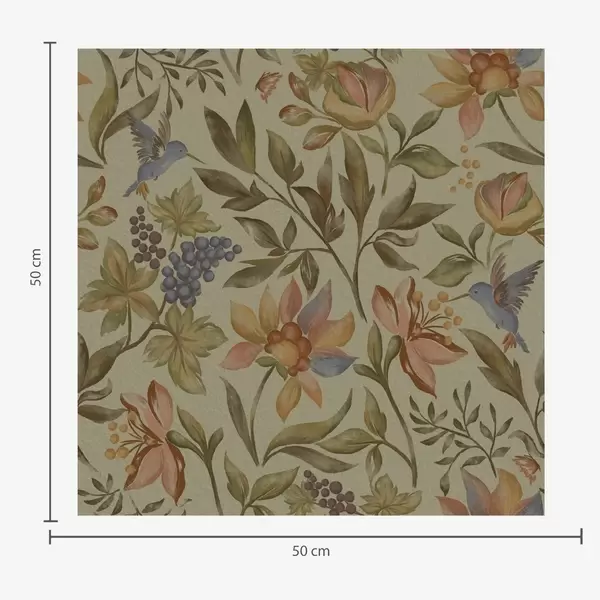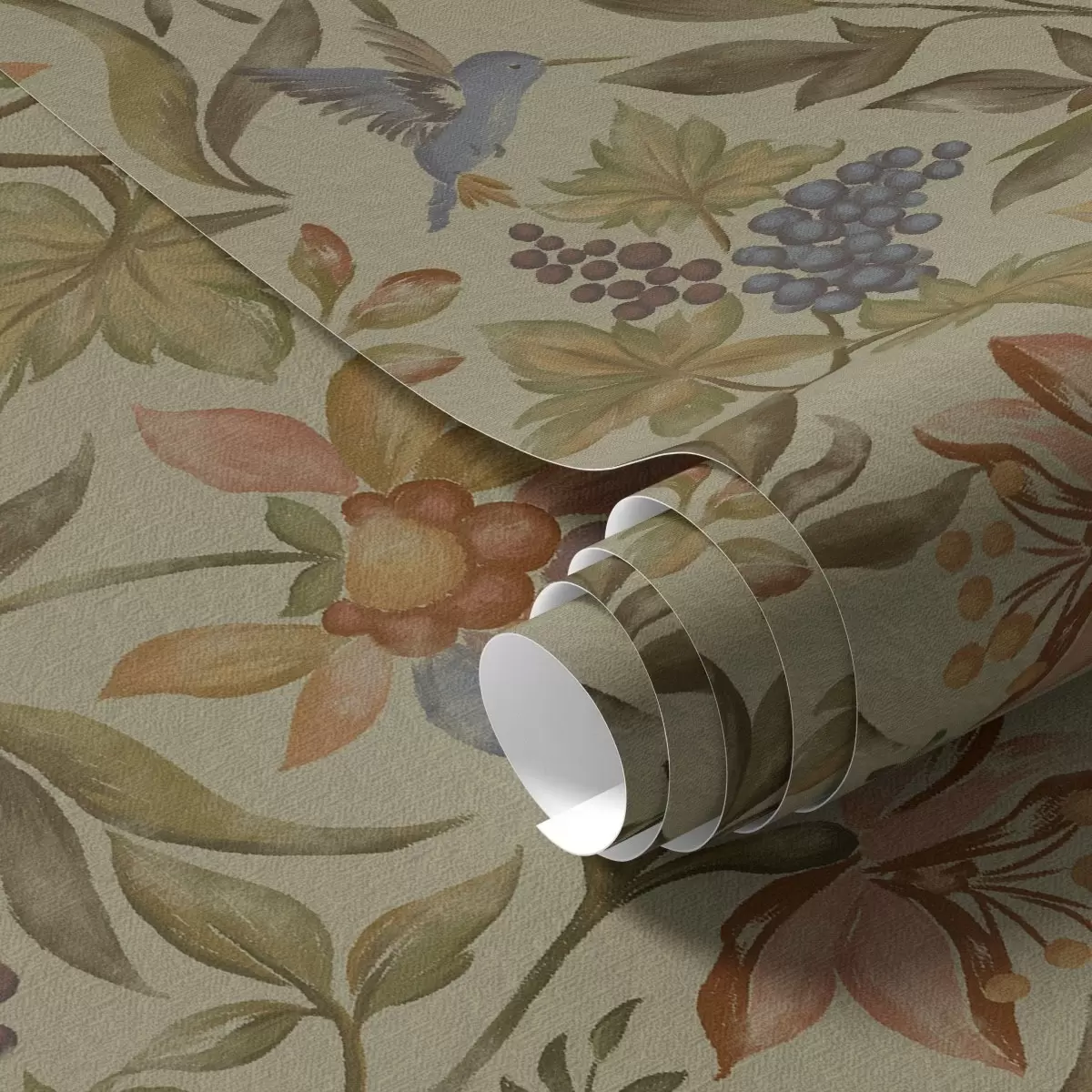 Tapeta Starinsko cvijeće i ptice s grožđem na maslinovoj pozadini br. a00594