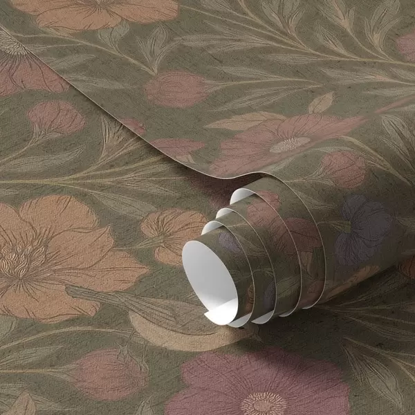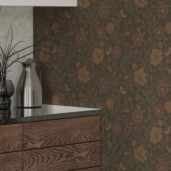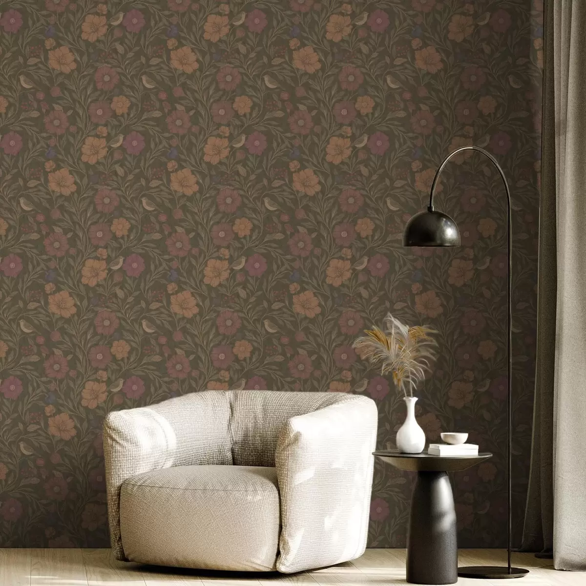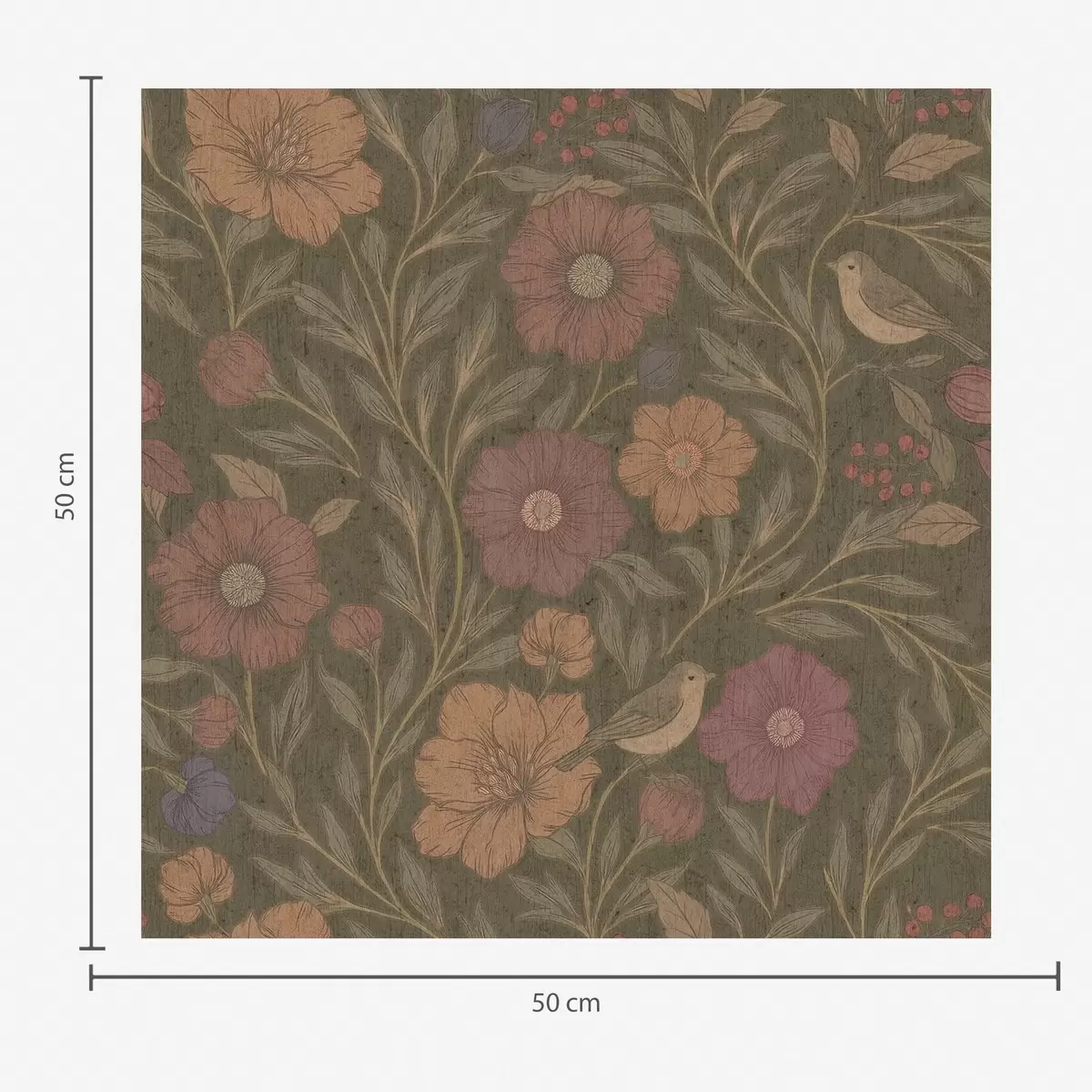 Tapeta Jesensko cvijeće i ptice na maslinasto smeđoj pozadini br. a00605