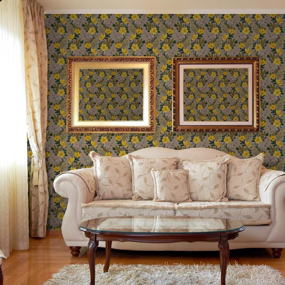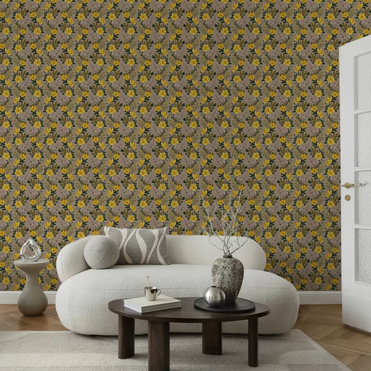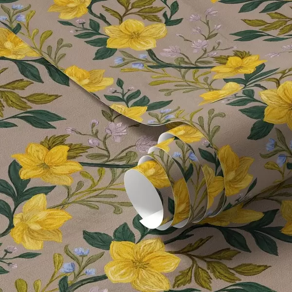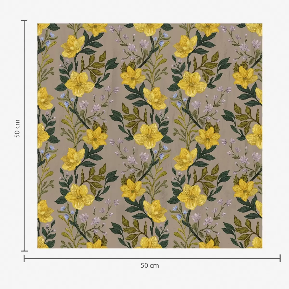 Tapeta Žuto cvijeće u okomitim vijencima na taupe pozadini br. a00632v1