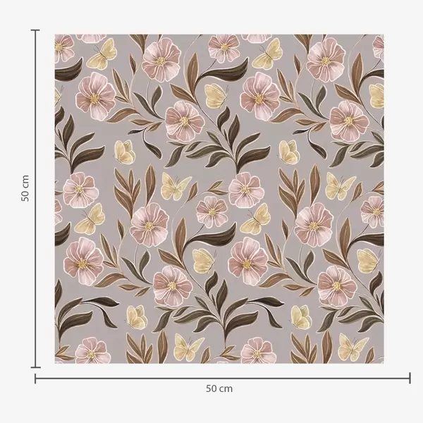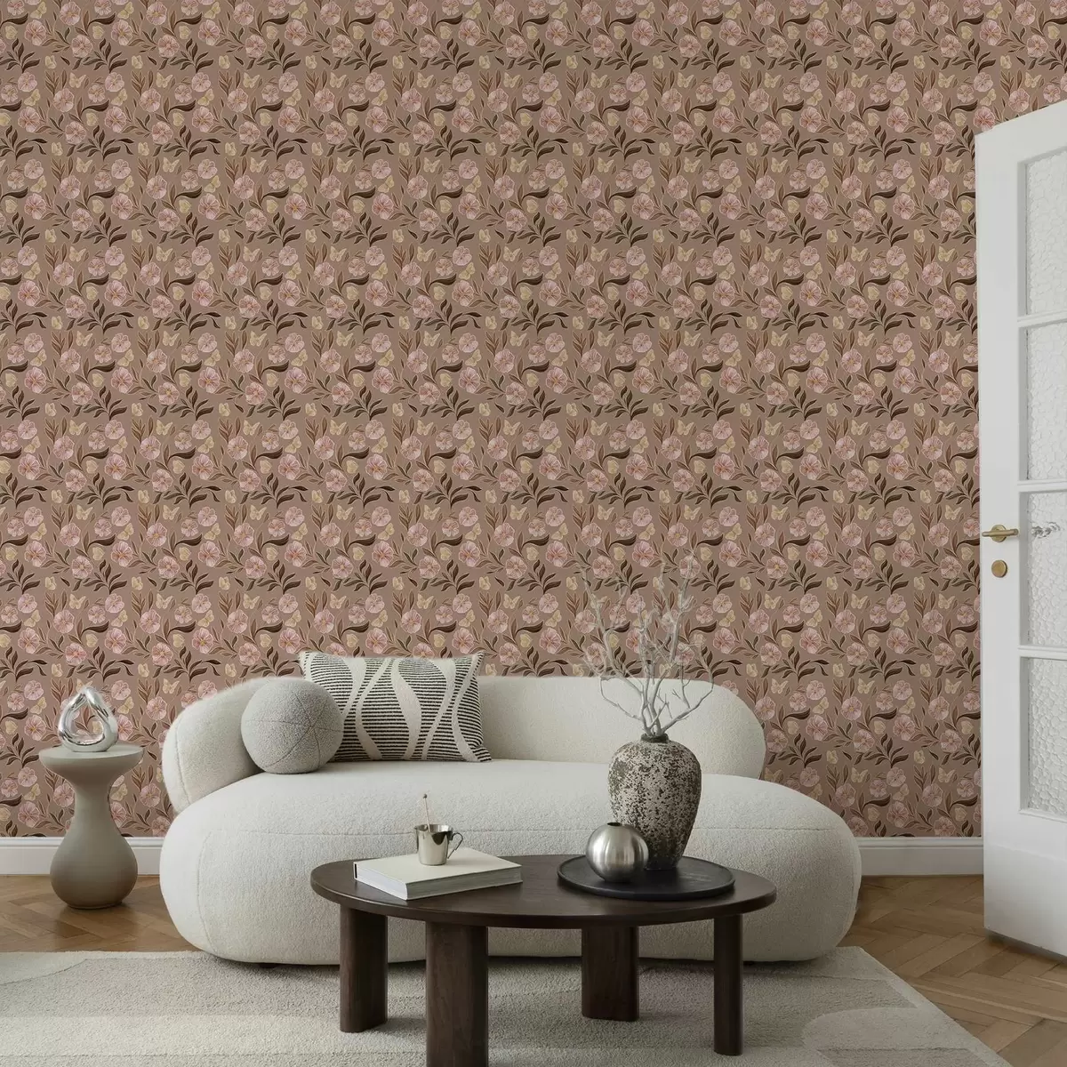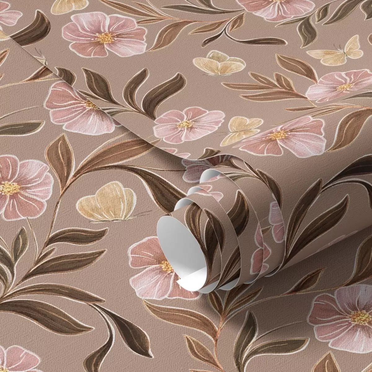 Tapeta Ružičasto cvijeće i leptiri na toploj smeđoj pozadini br. a00633v1