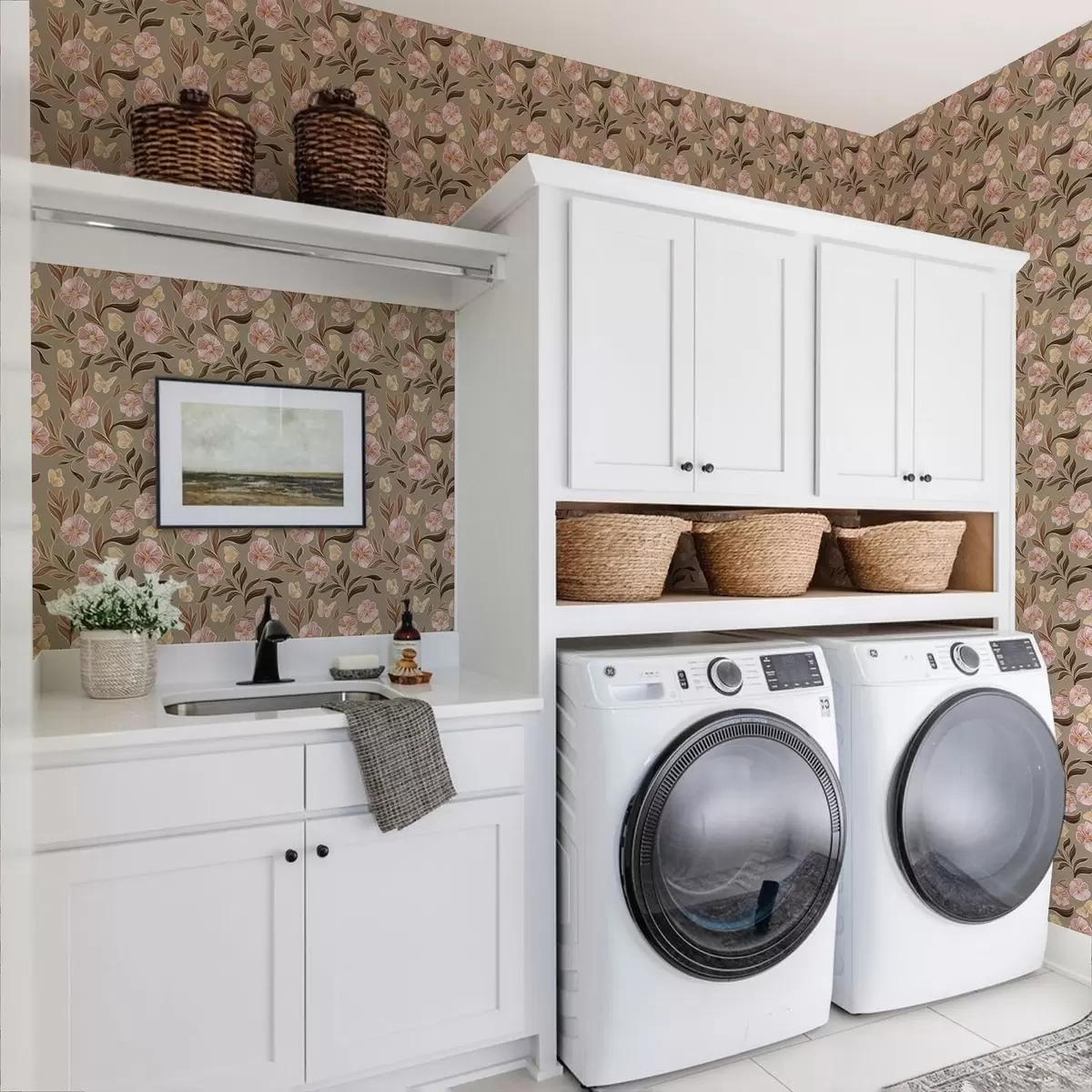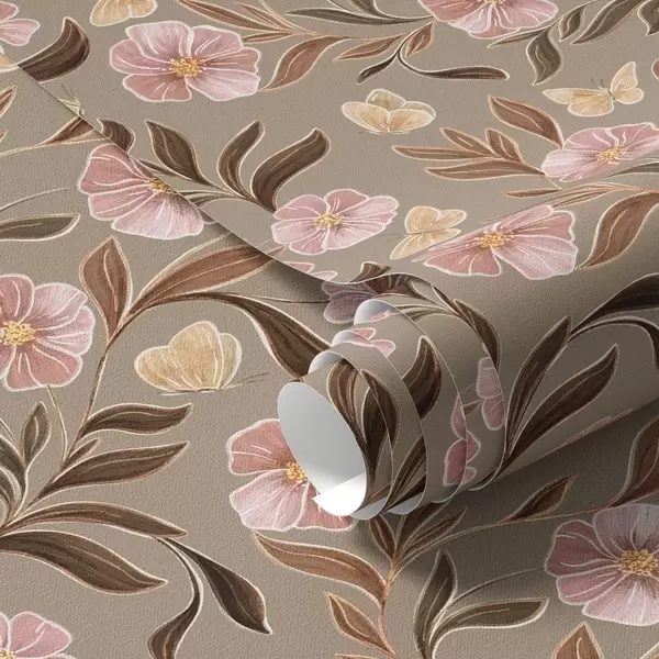 Tapeta Ružičasto cvijeće i leptiri na maslinasto bež pozadini br. a00633v2