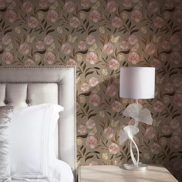 Tapeta Ružičasto cvijeće i leptiri na maslinasto bež pozadini br. a00633v2
