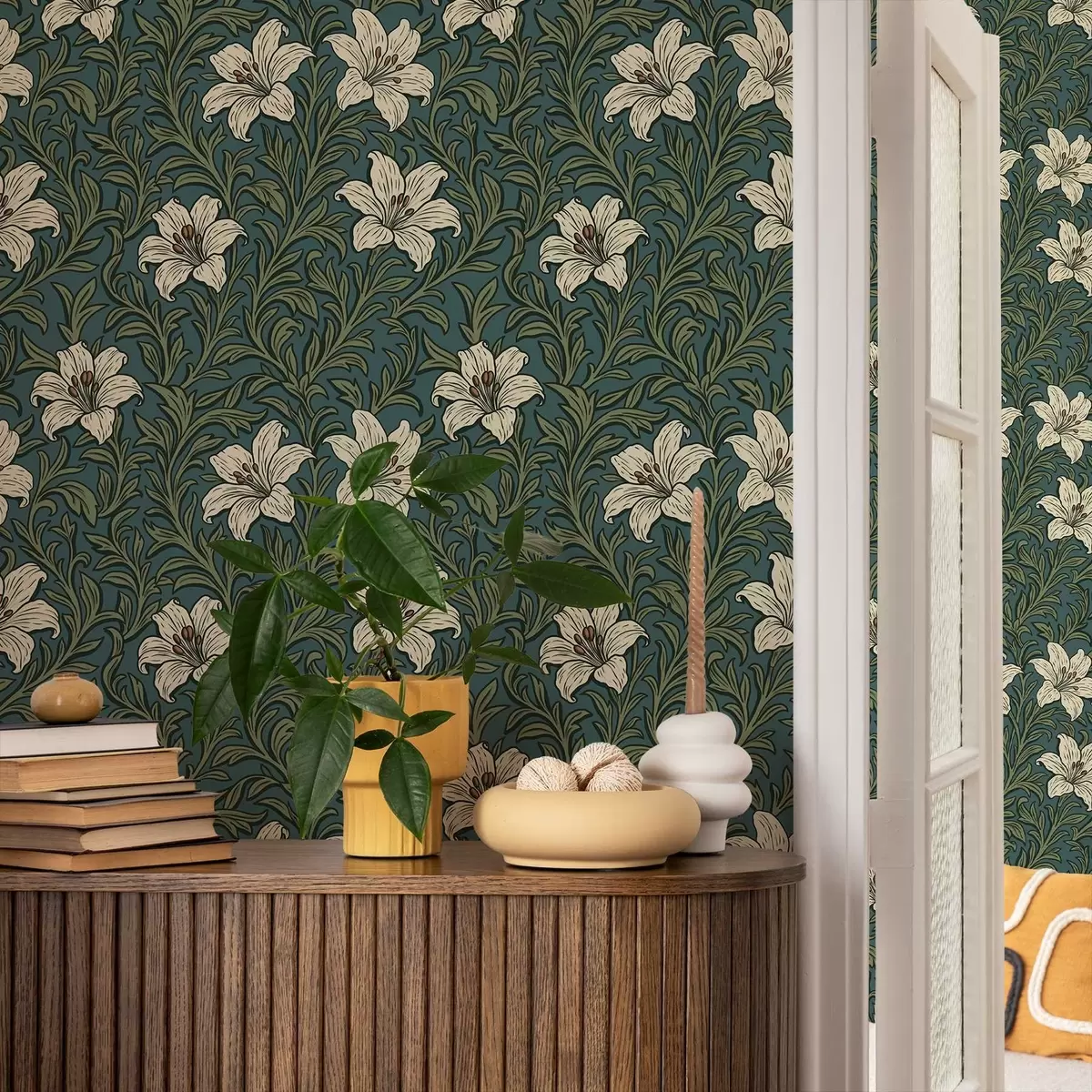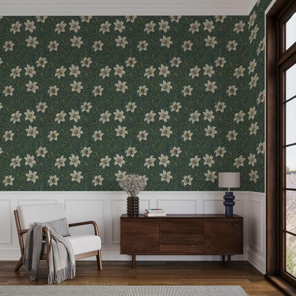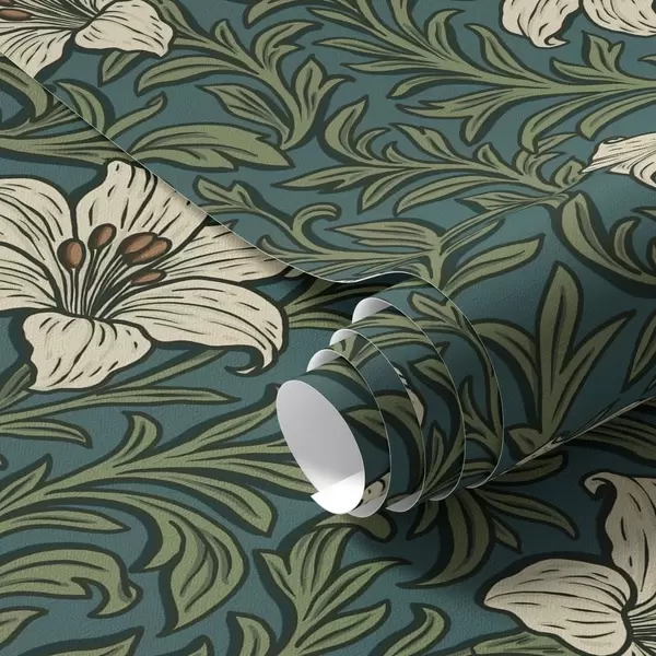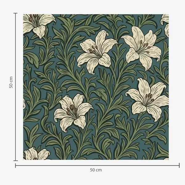 Tapeta Krem ljiljani među gustim zelenilom na tirkiznoj pozadini br. a00645