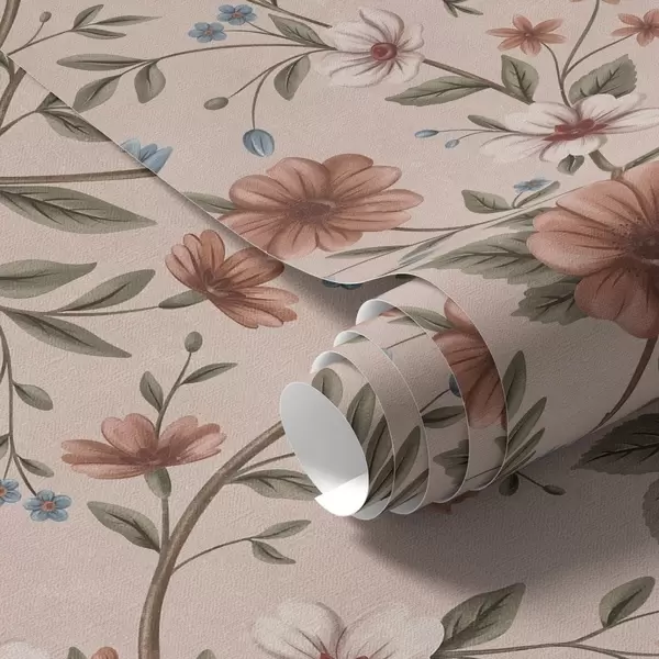 Tapeta Ružičasto-koraljni cvjetovi i lišće na prašnjavo ružičastoj br. a00667