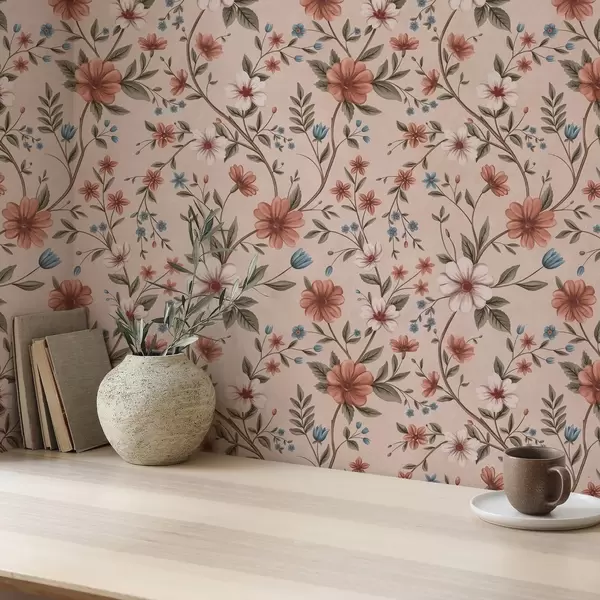 Tapeta Ružičasto-koraljni cvjetovi i lišće na prašnjavo ružičastoj br. a00667