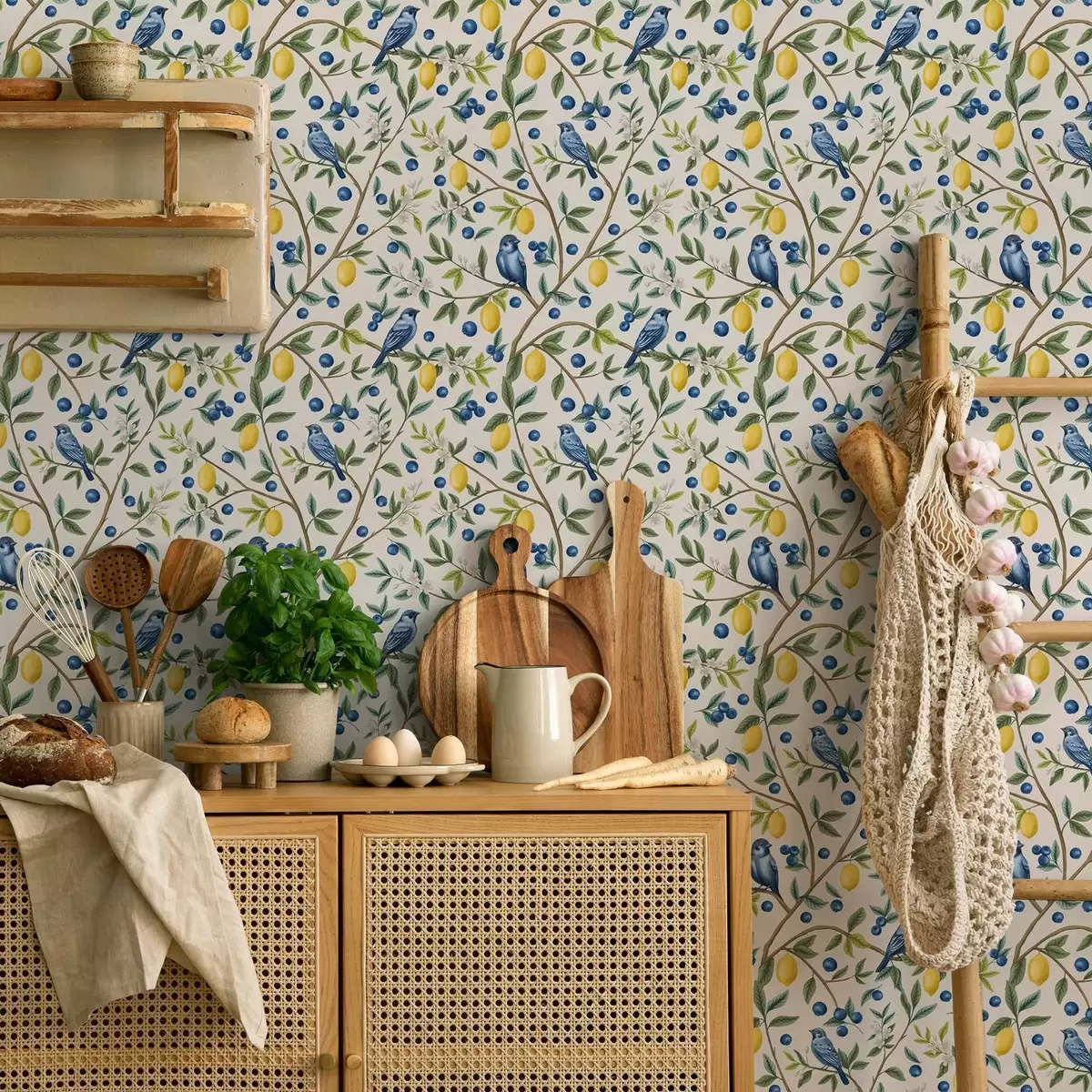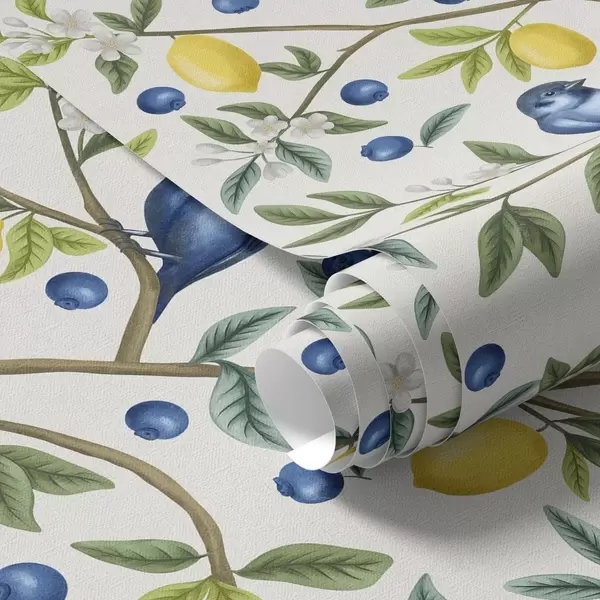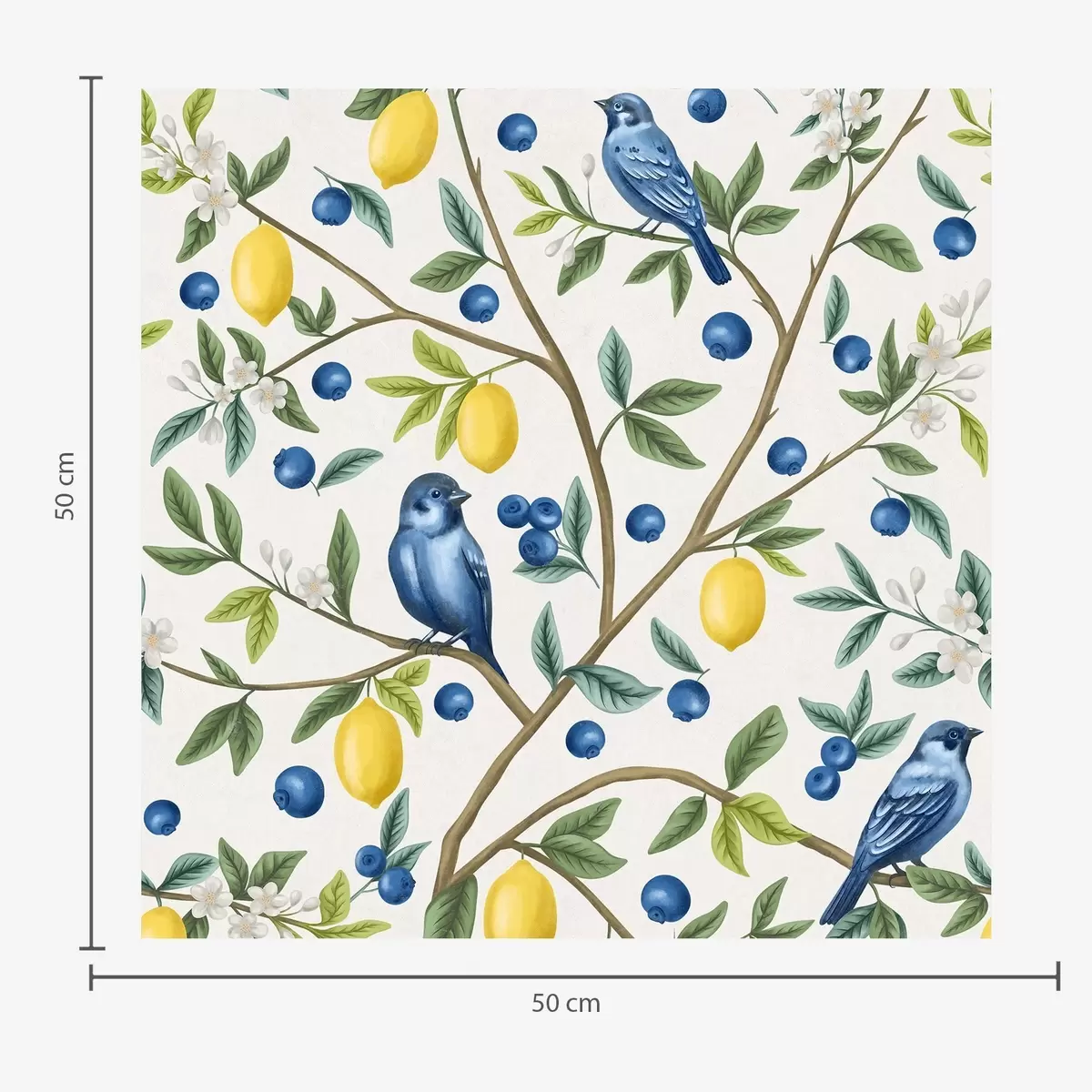 Tapeta Plave ptice, limuni i bobice na bijeloj pozadini br. a00668
