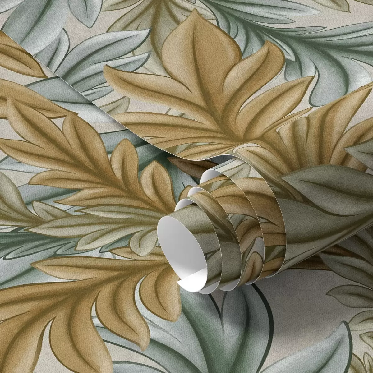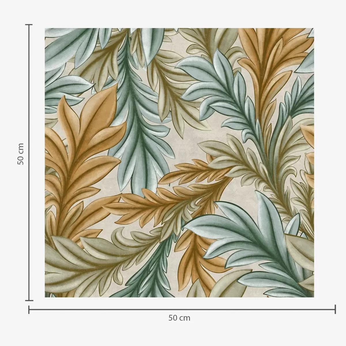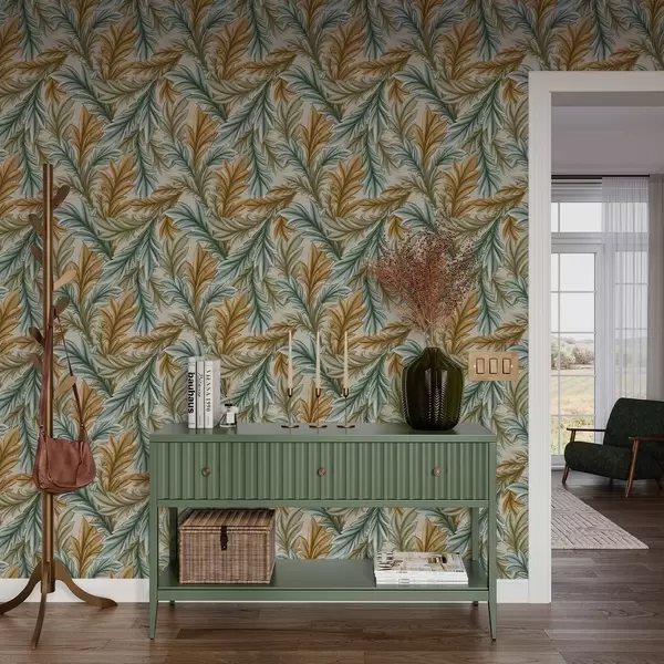 Tapeta Dekorativno lišće u toploj oker i zelenoj paleti br. a00673