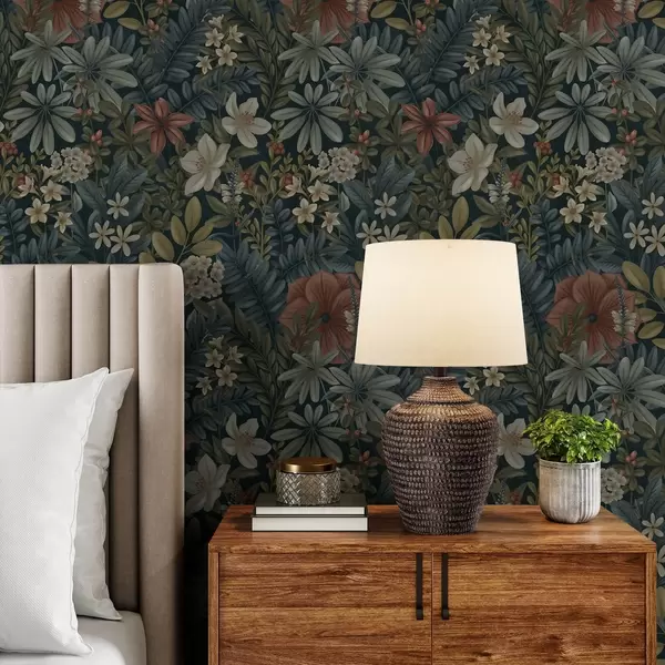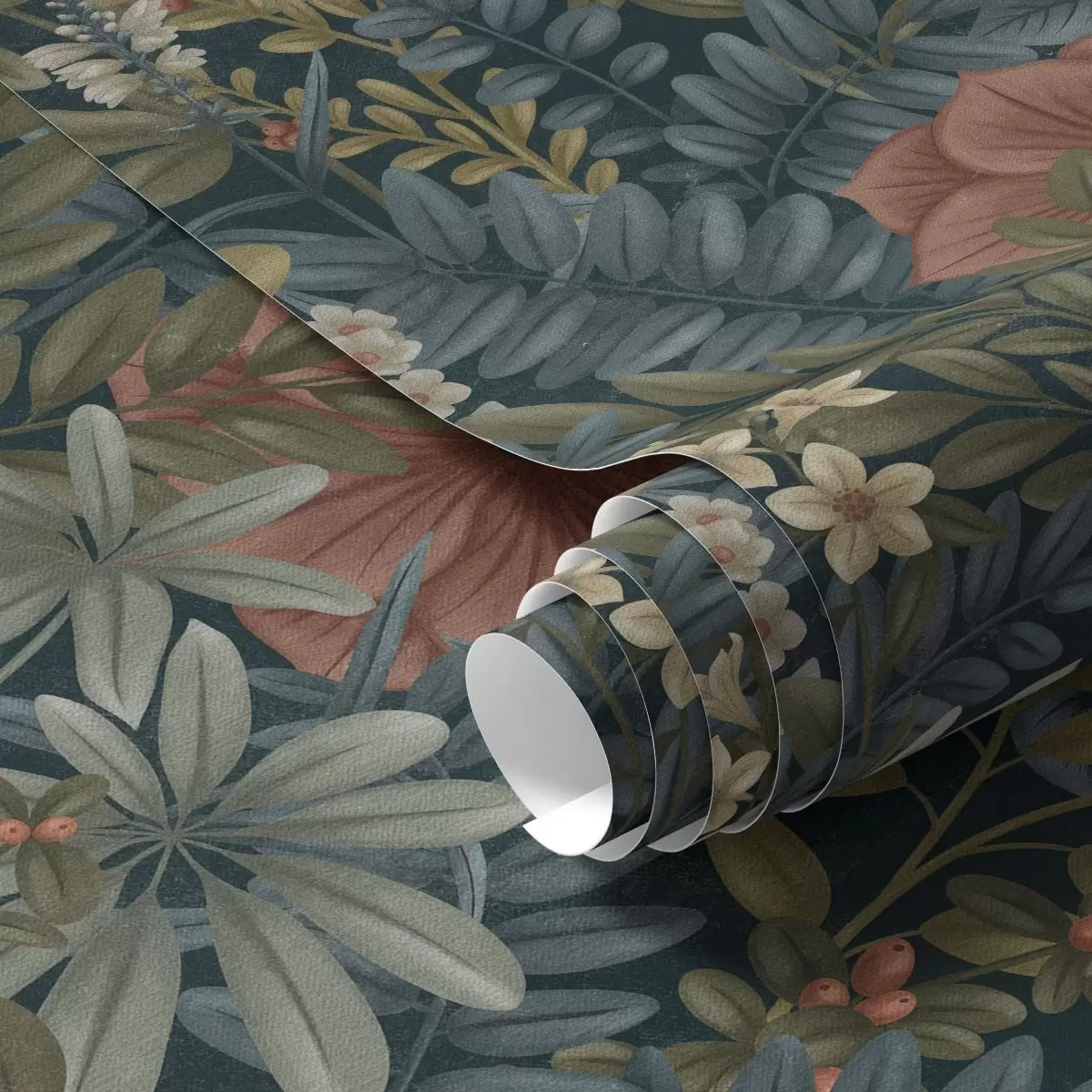Tapeta Tamna pozadina s gustim cvijećem i lišćem u toplim tonovima br. a00678