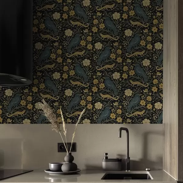 Tapeta Ptice, gušteri i puževi među cvijećem na tamnoj pozadini br. a00691