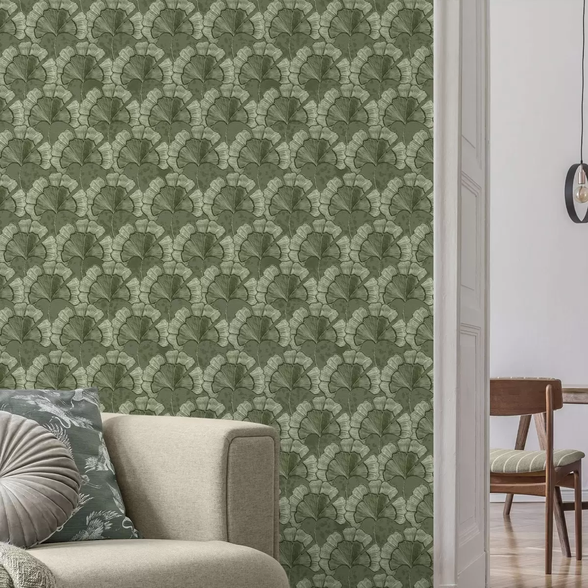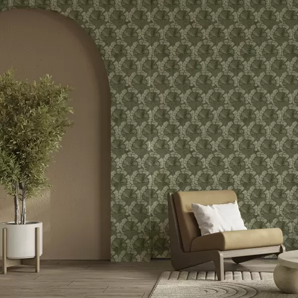 Tapeta Grafički uzorak s ginkom u hladnoj zelenoj paleti br. a00709