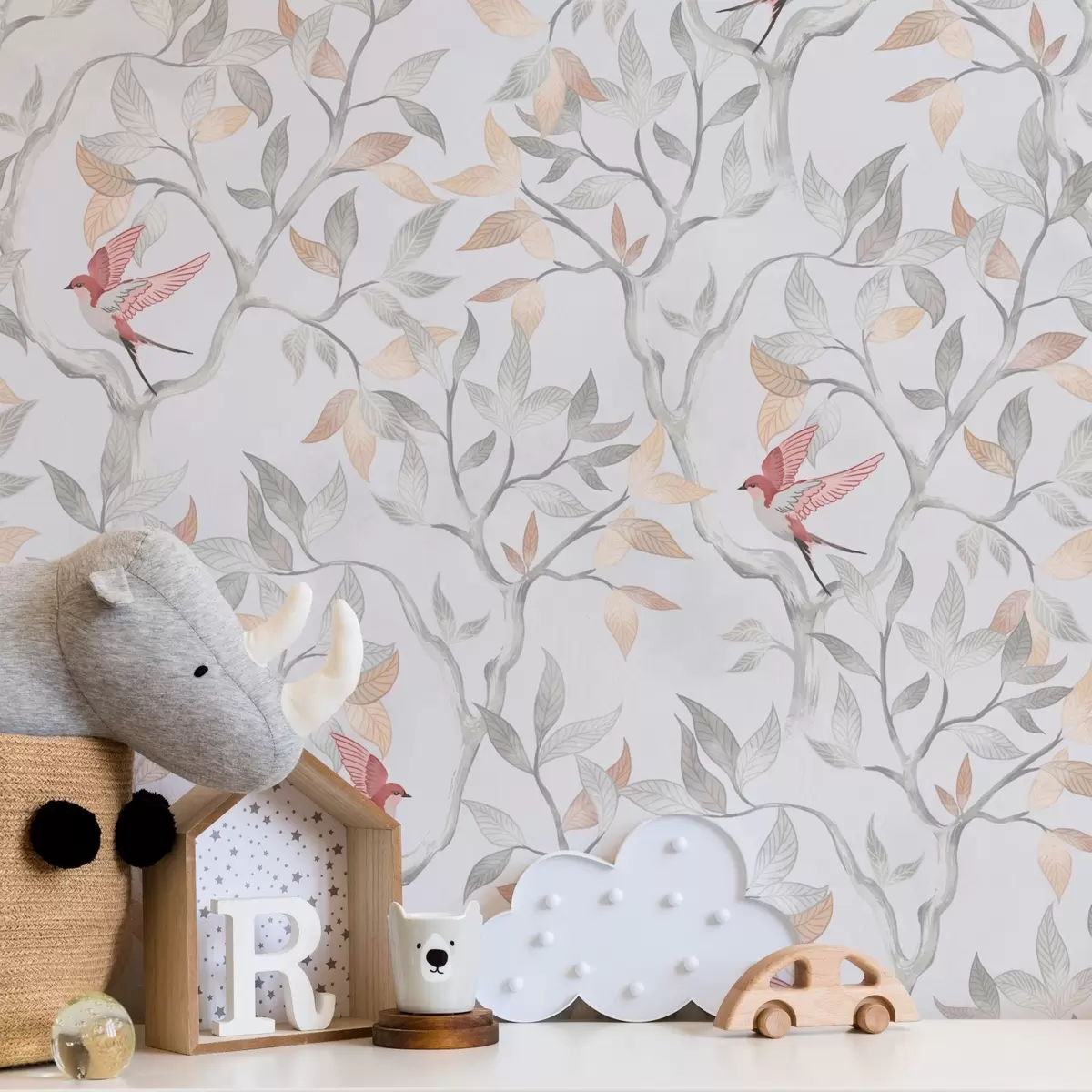 Tapeta Svijetle grane s lišćem i pticama u breskvastim tonovima br. a00716