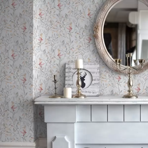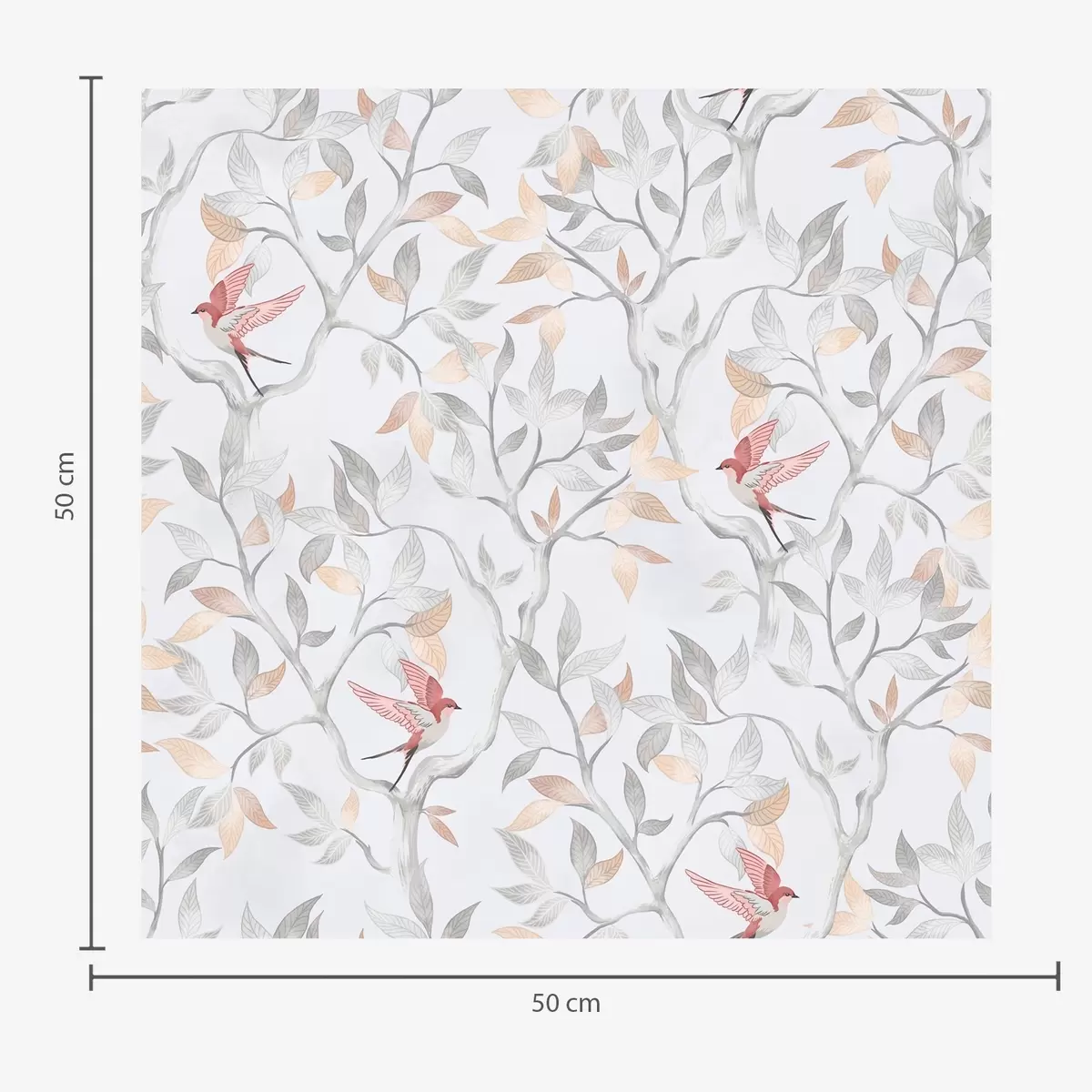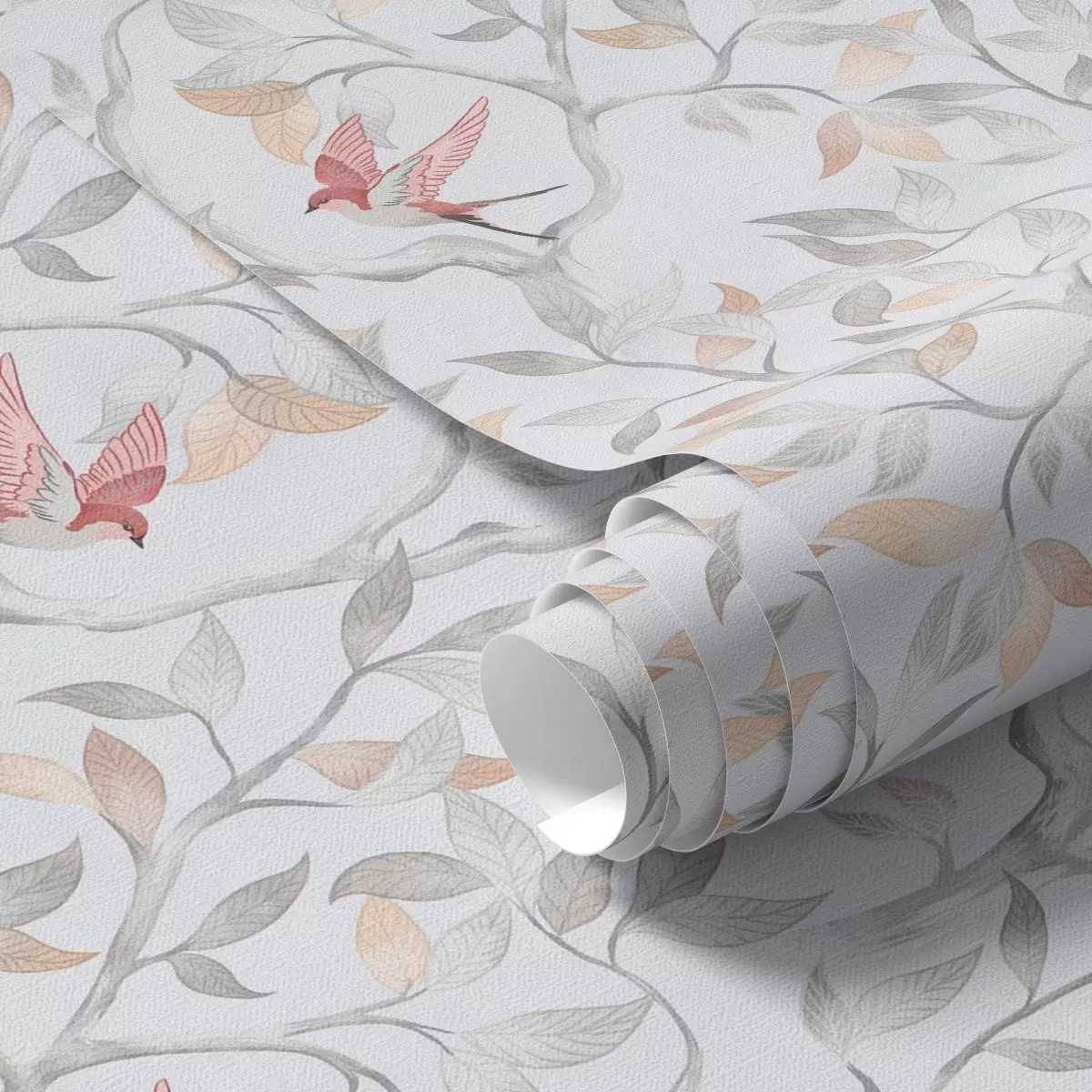 Tapeta Svijetle grane s lišćem i pticama u breskvastim tonovima br. a00716